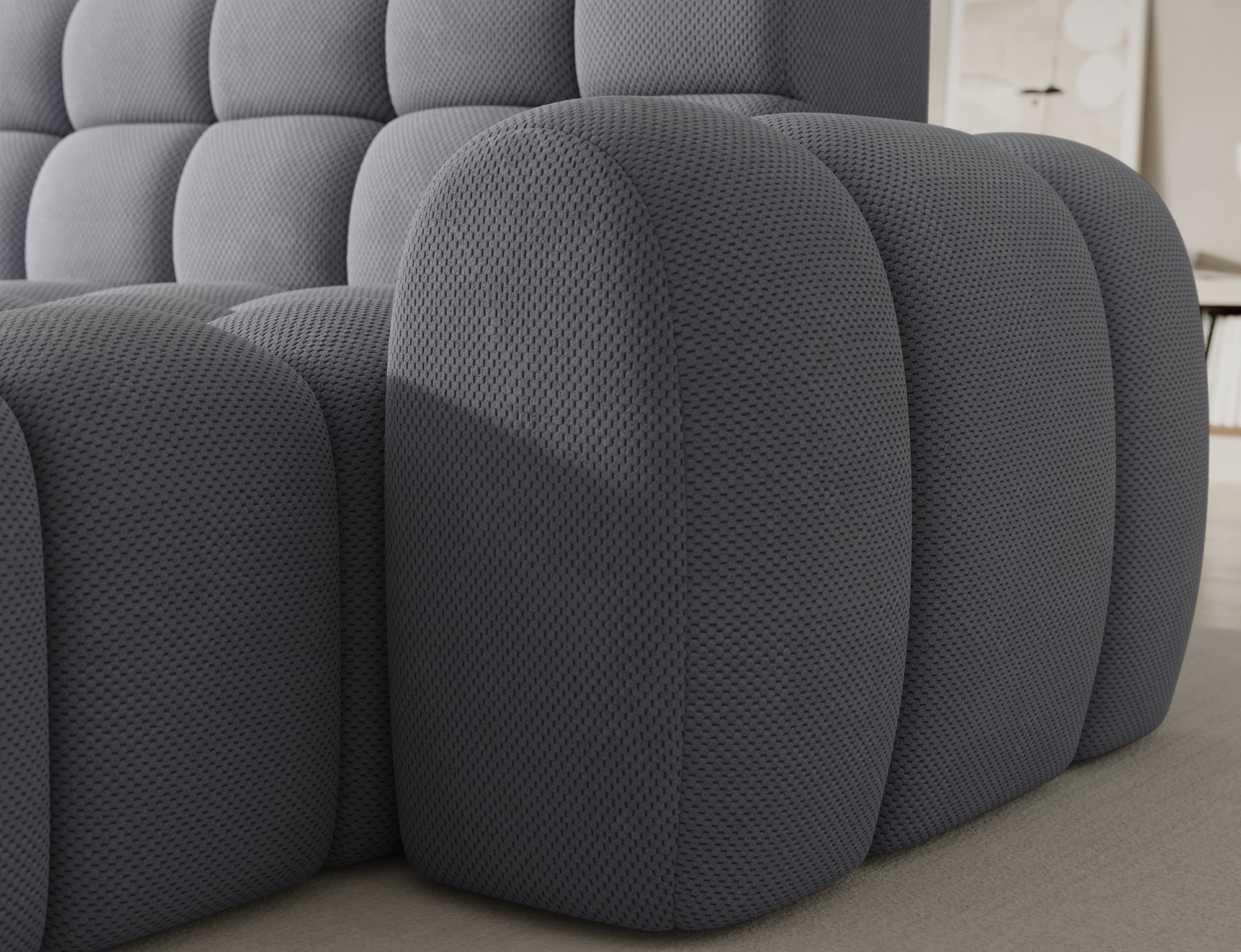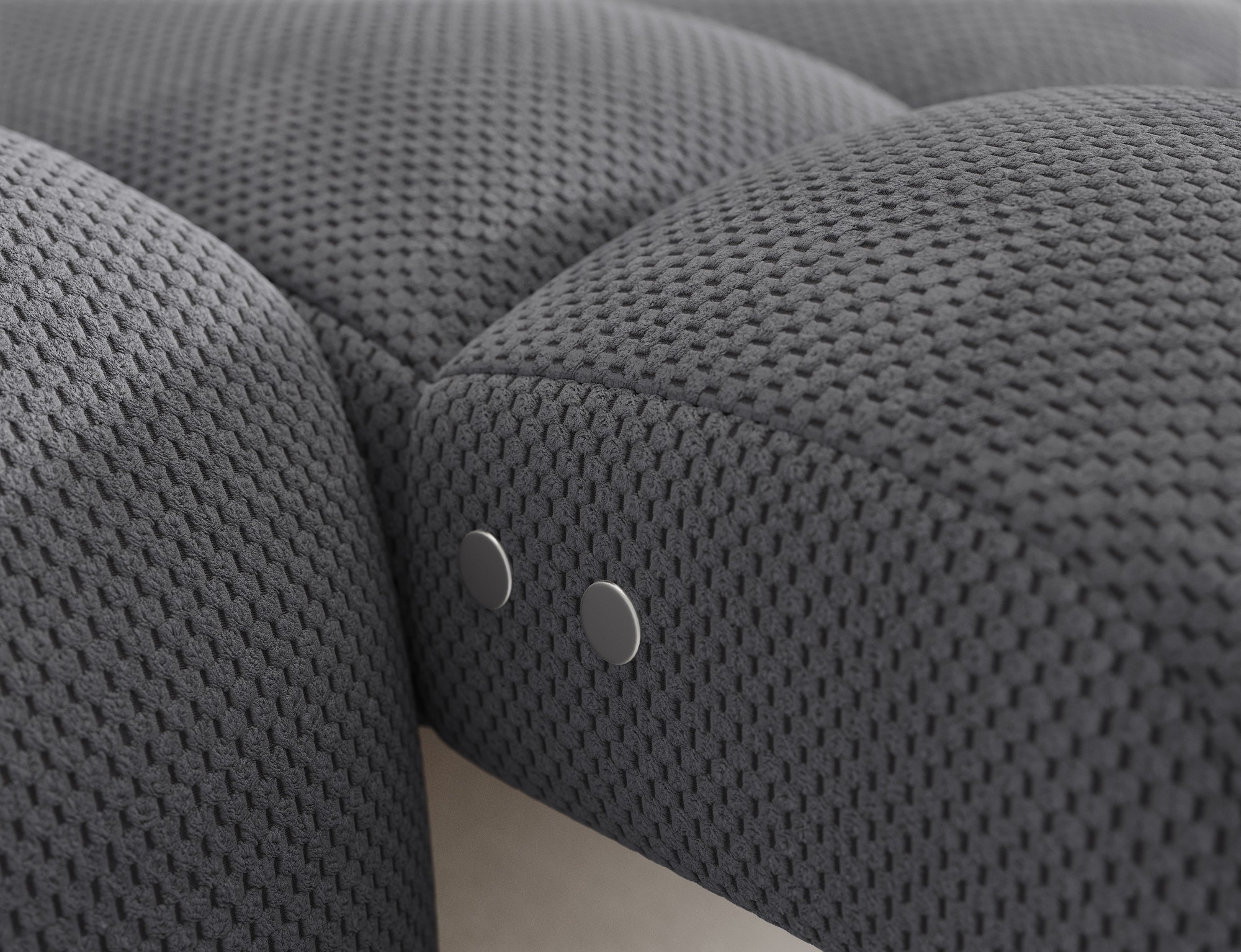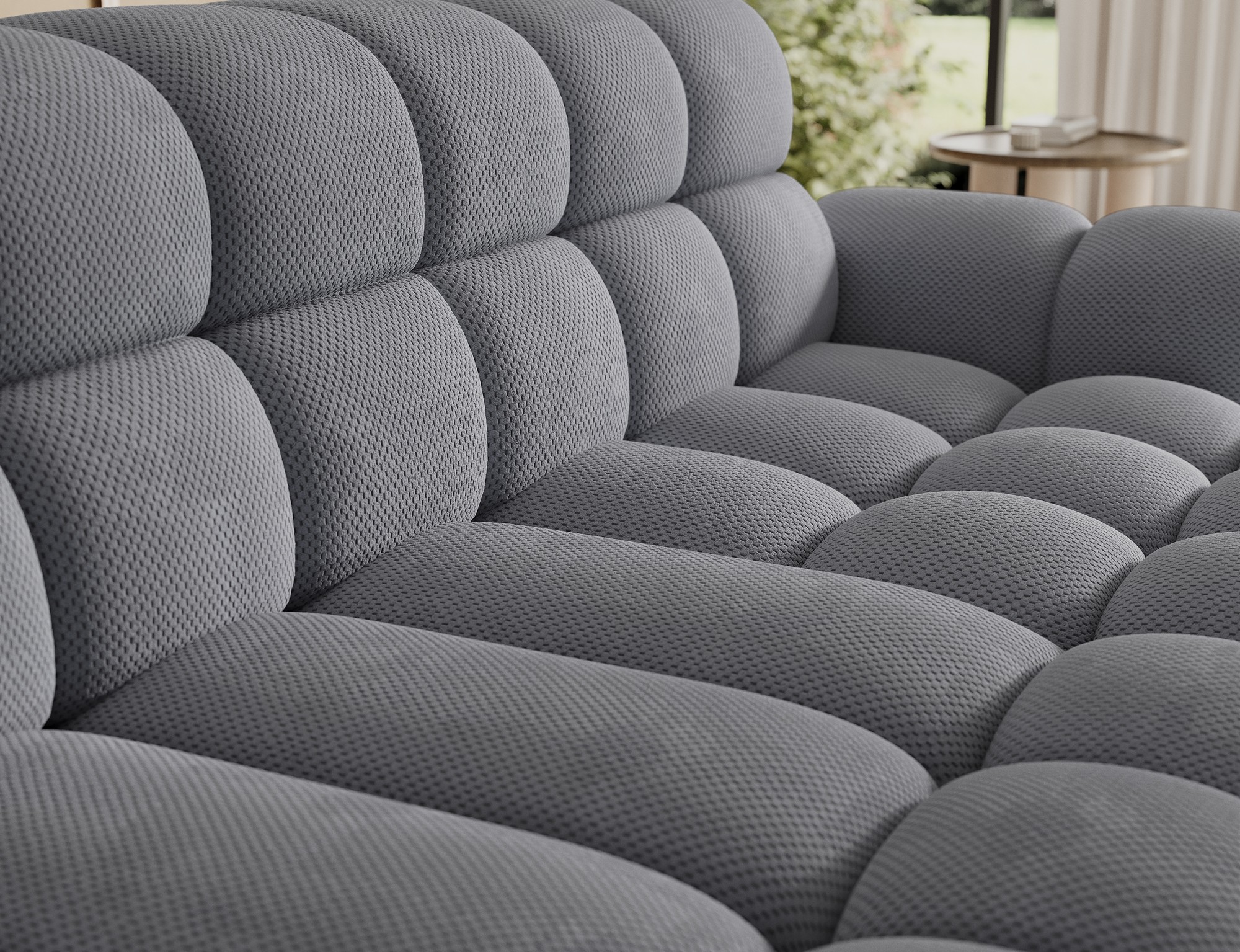 Le tissu nid d’abeille se distingue par sa texture subtile et son aspect moderne qui apporte du relief au canapé. Son coloris gris intemporel s’harmonise facilement avec différents styles de décoration, du contemporain au plus minimaliste.