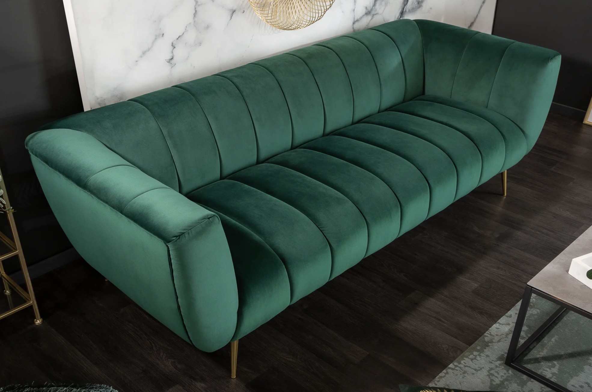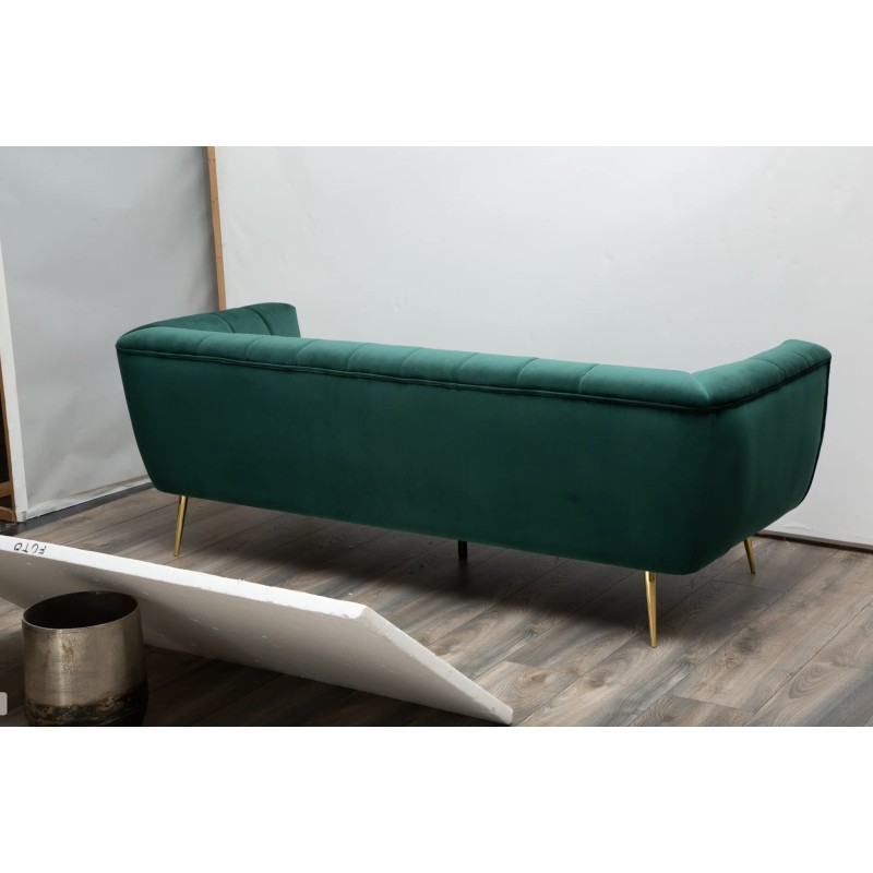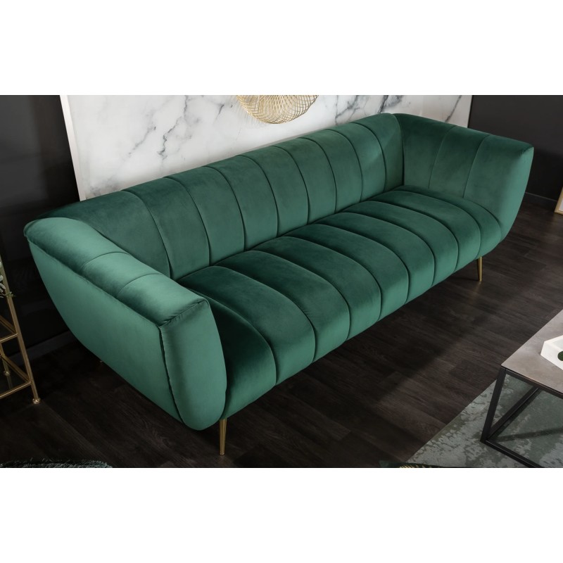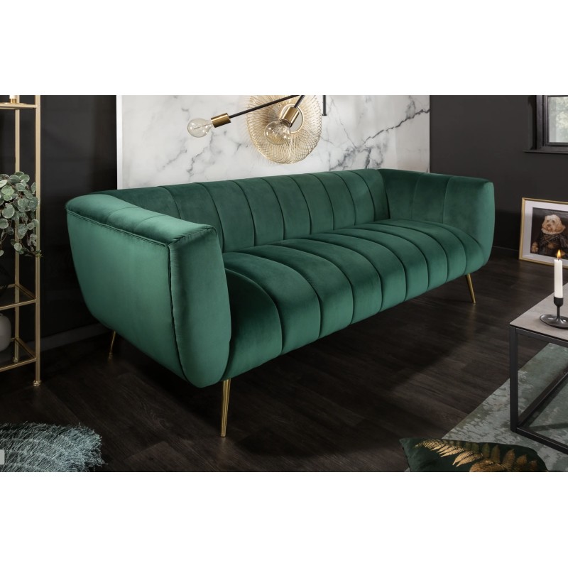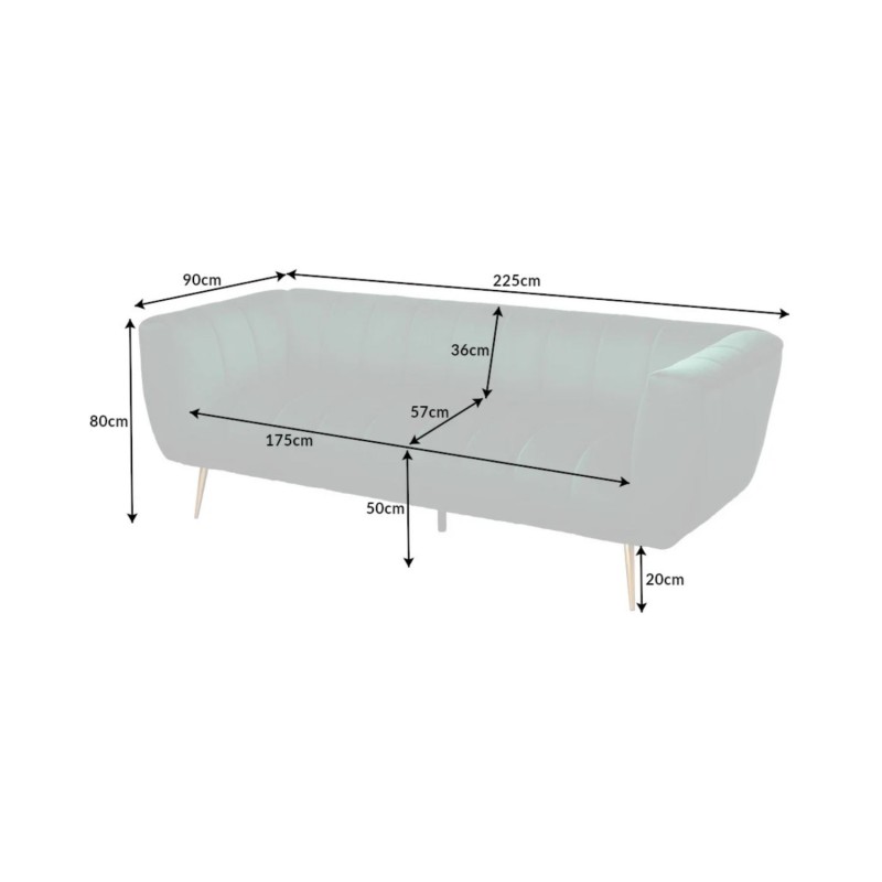 Ce canapé repose sur un cadre en bois associé à des pieds en métal aspect doré, offrant un contraste élégant et une bonne stabilité. Son revêtement en velours polyester à aspect rainuré apporte une touche de sophistication et un confort agréable au quotidien. Pensé pour un usage simple et durable, il privilégie l’esthétique et l’assise confortable.