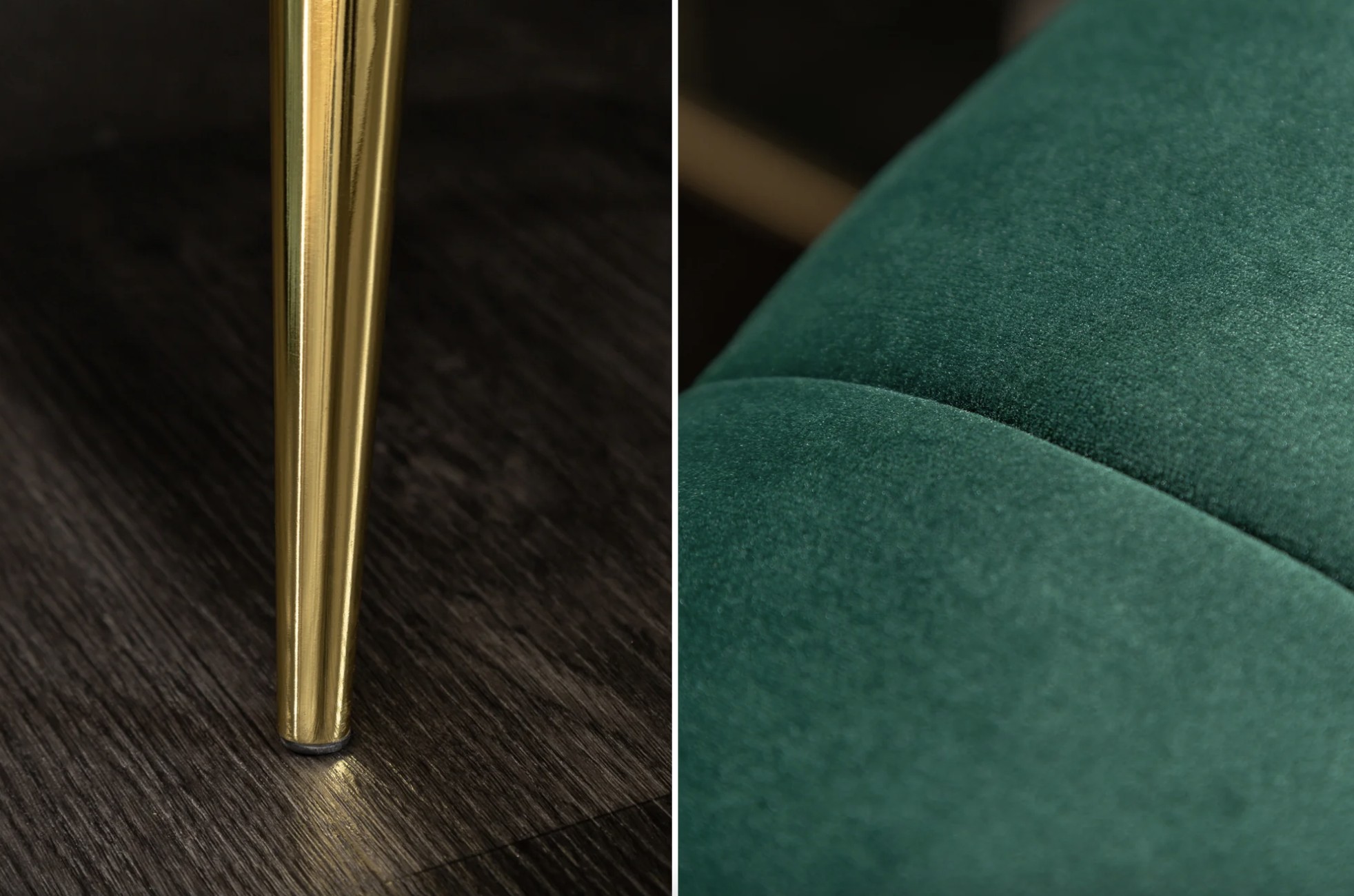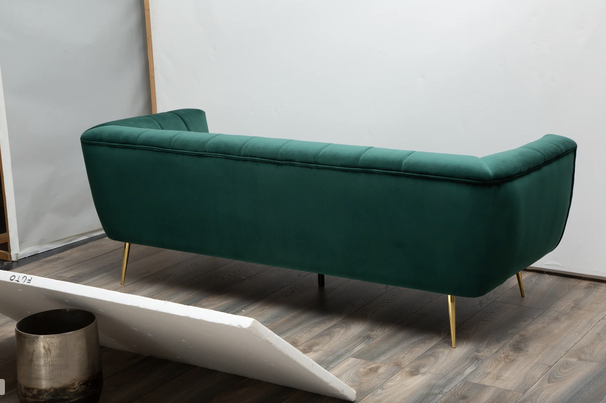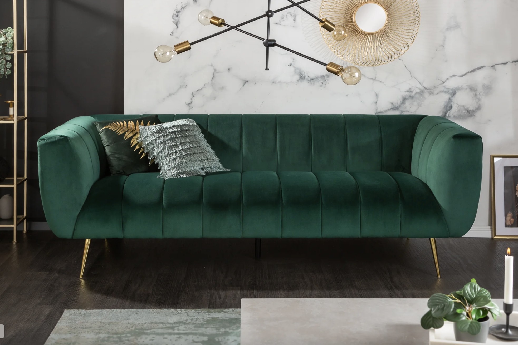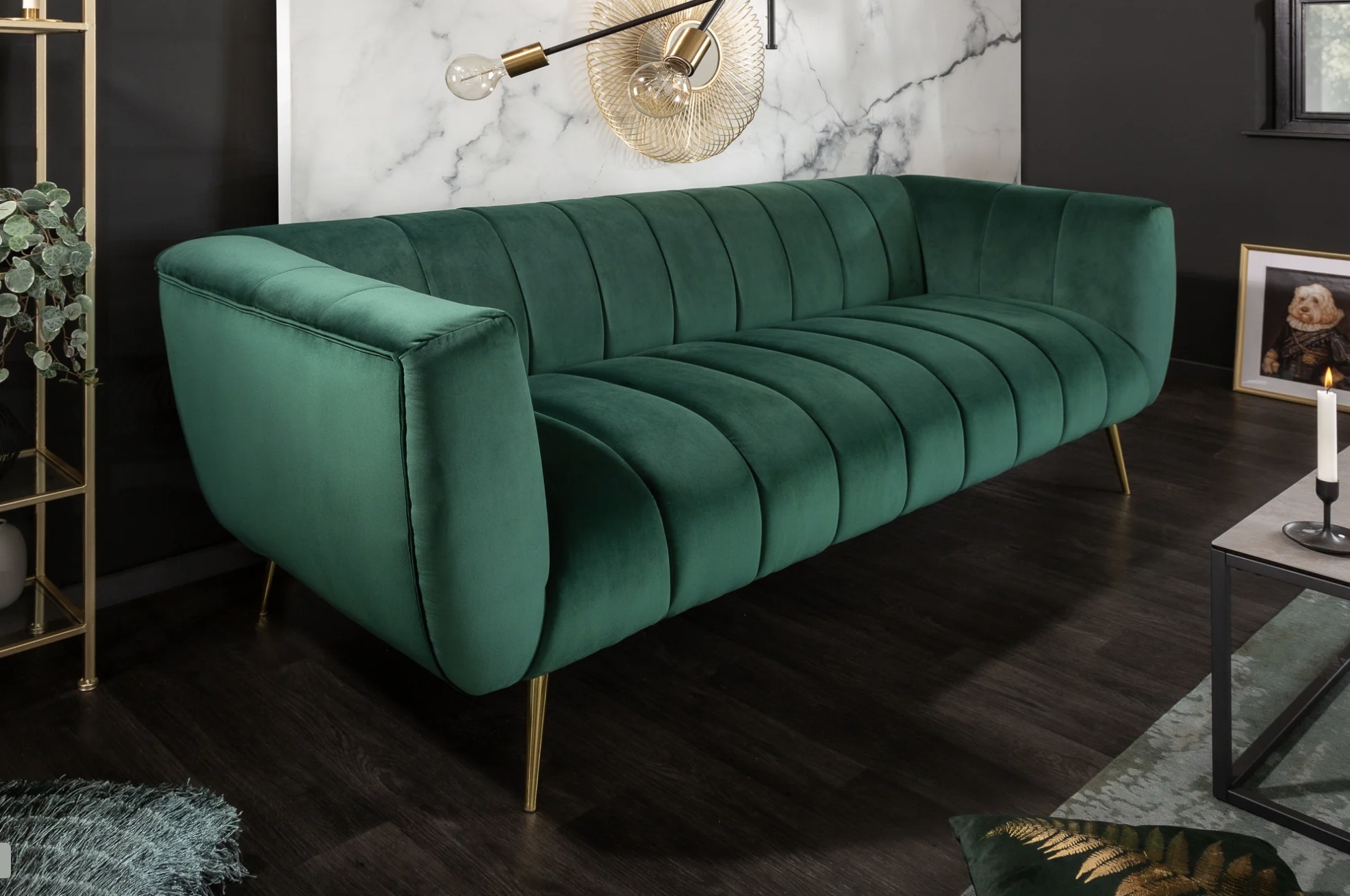 Ce canapé repose sur un cadre en bois associé à des pieds en métal aspect doré, offrant un contraste élégant et une bonne stabilité. Son revêtement en velours polyester à aspect rainuré apporte une touche de sophistication et un confort agréable au quotidien. Pensé pour un usage simple et durable, il privilégie l’esthétique et l’assise confortable.