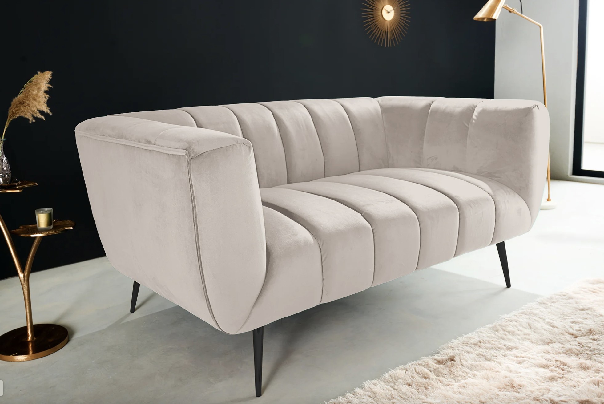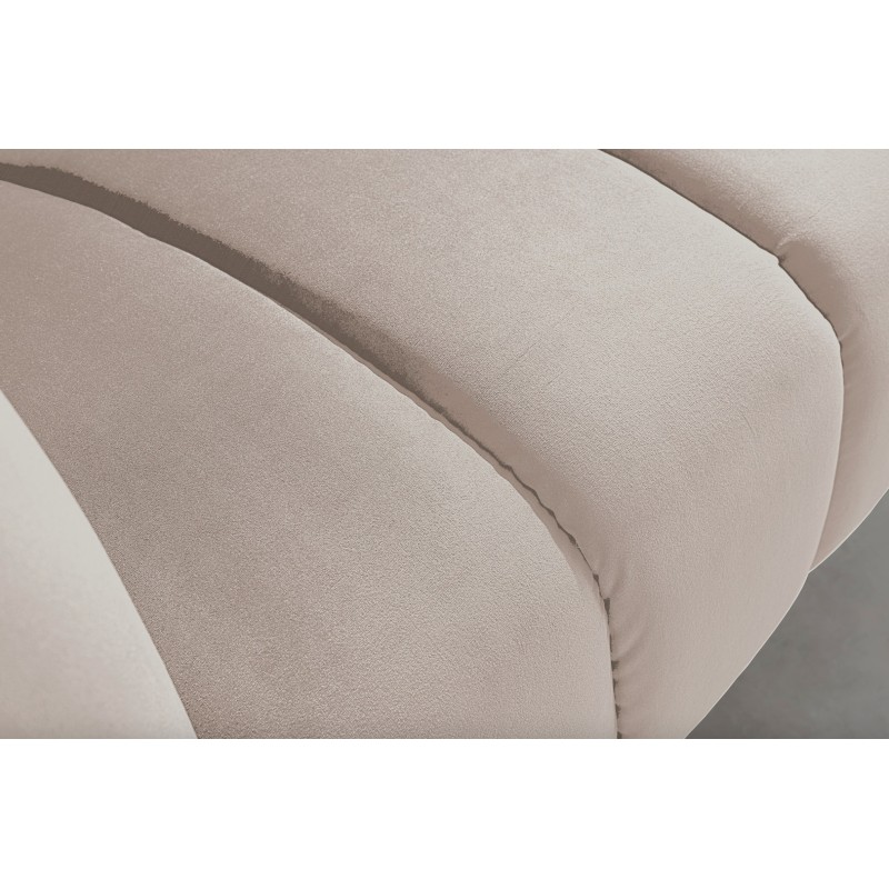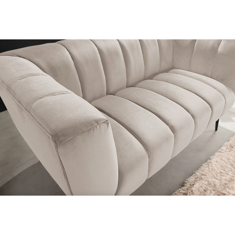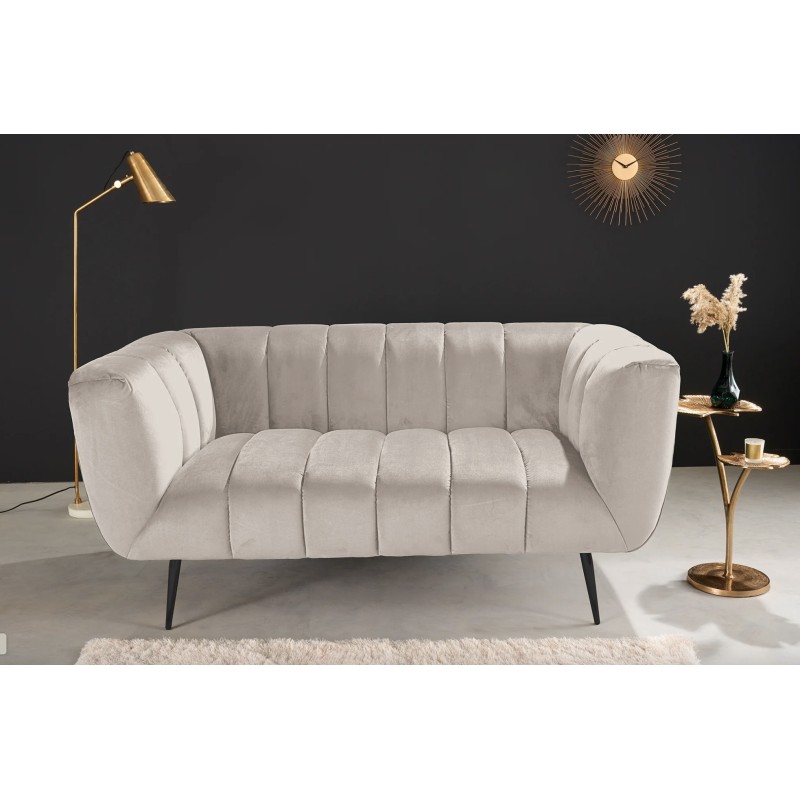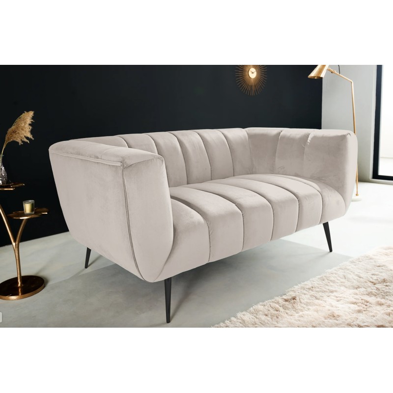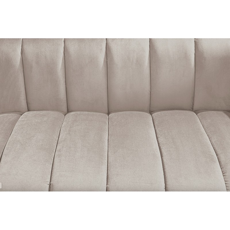 Ce modèle repose sur une structure associant métal et matériaux textiles, offrant stabilité et durabilité. Son revêtement en velours polyester à aspect rainuré apporte du relief et un toucher agréable. Les pieds en métal noir créent un contraste moderne qui souligne le caractère chic du canapé, tandis que les accoudoirs intégrés renforcent le confort d’assise.