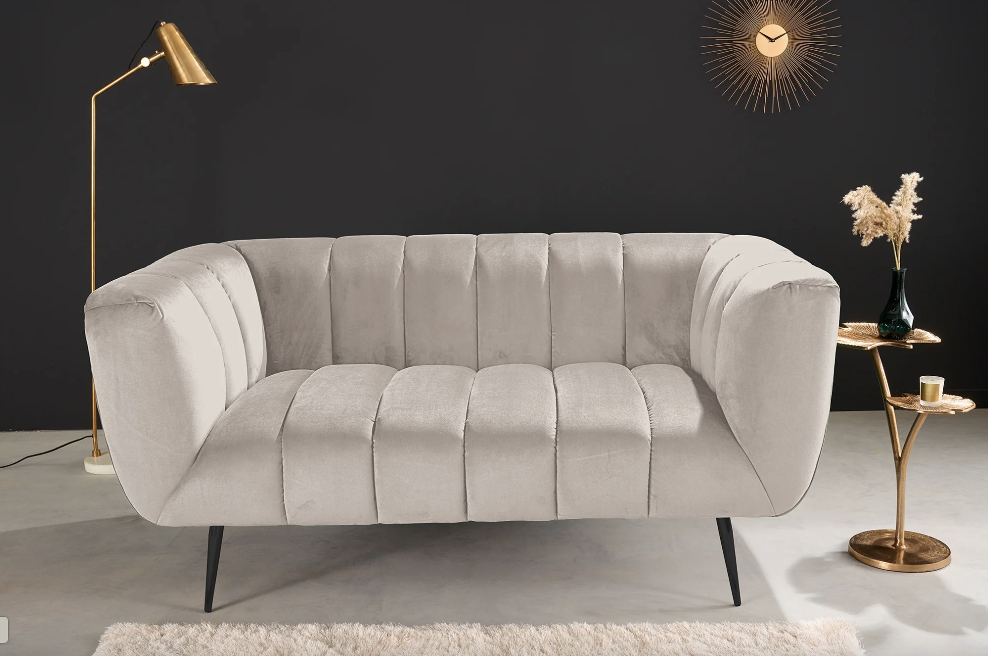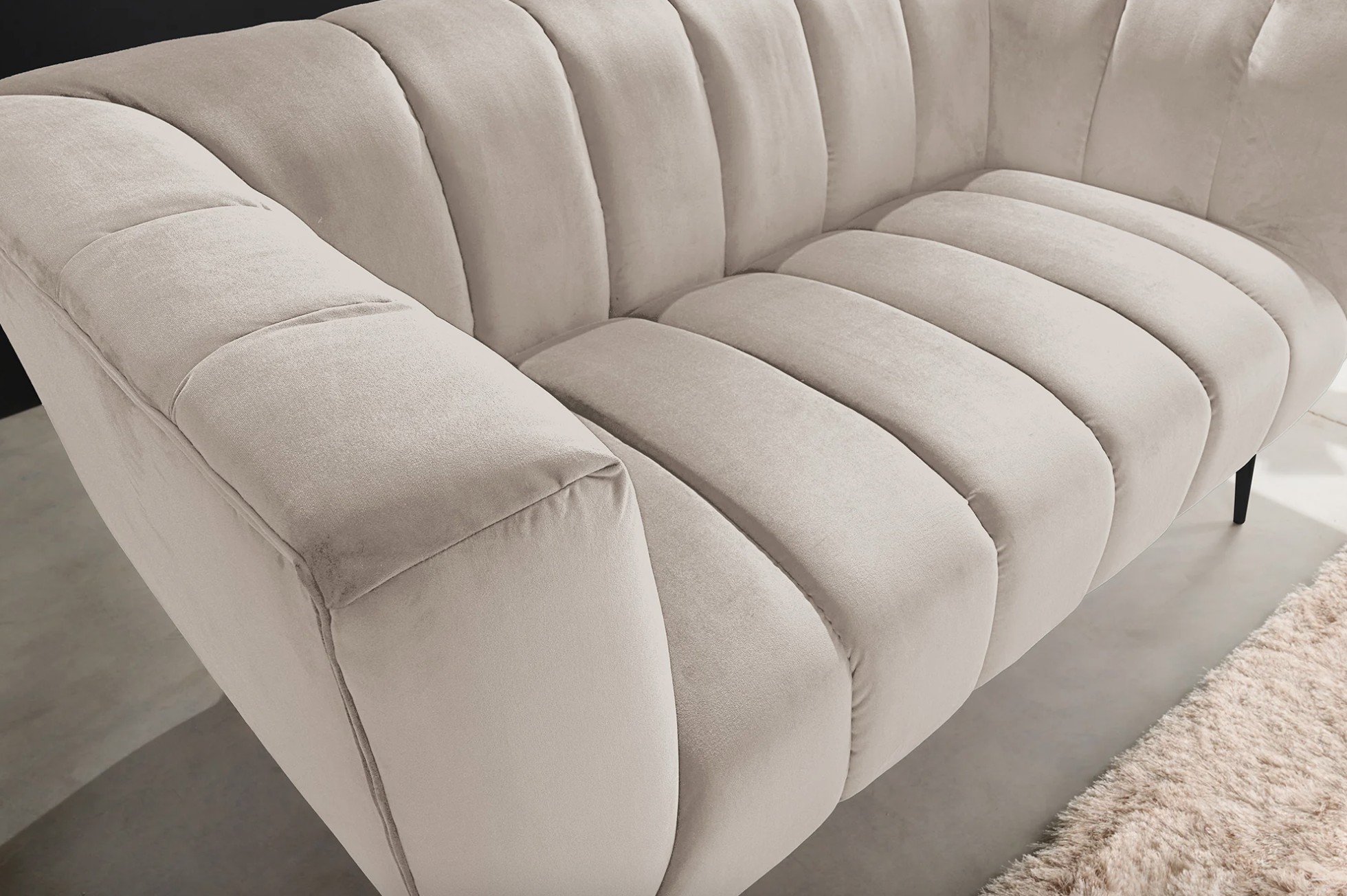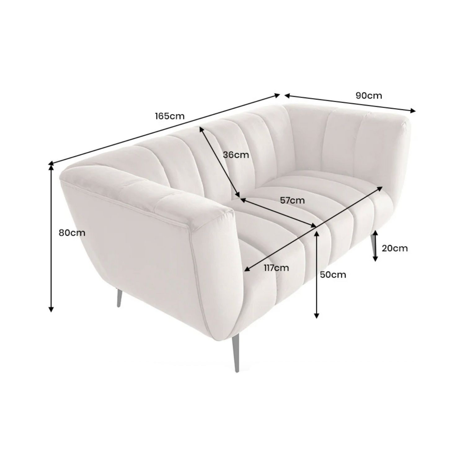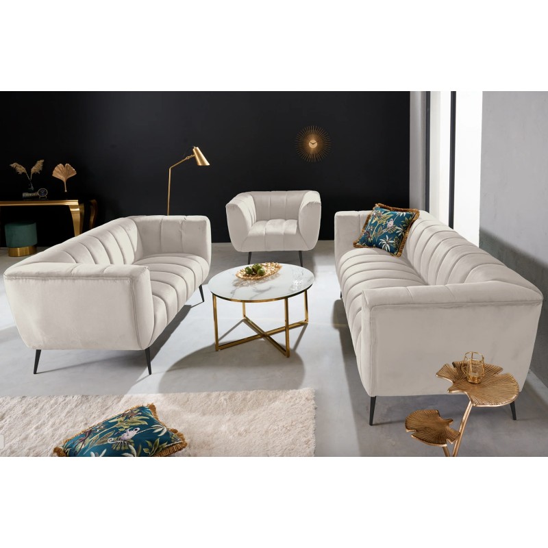 Ce modèle repose sur une structure associant métal et matériaux textiles, offrant stabilité et durabilité. Son revêtement en velours polyester à aspect rainuré apporte du relief et un toucher agréable. Les pieds en métal noir créent un contraste moderne qui souligne le caractère chic du canapé, tandis que les accoudoirs intégrés renforcent le confort d’assise.