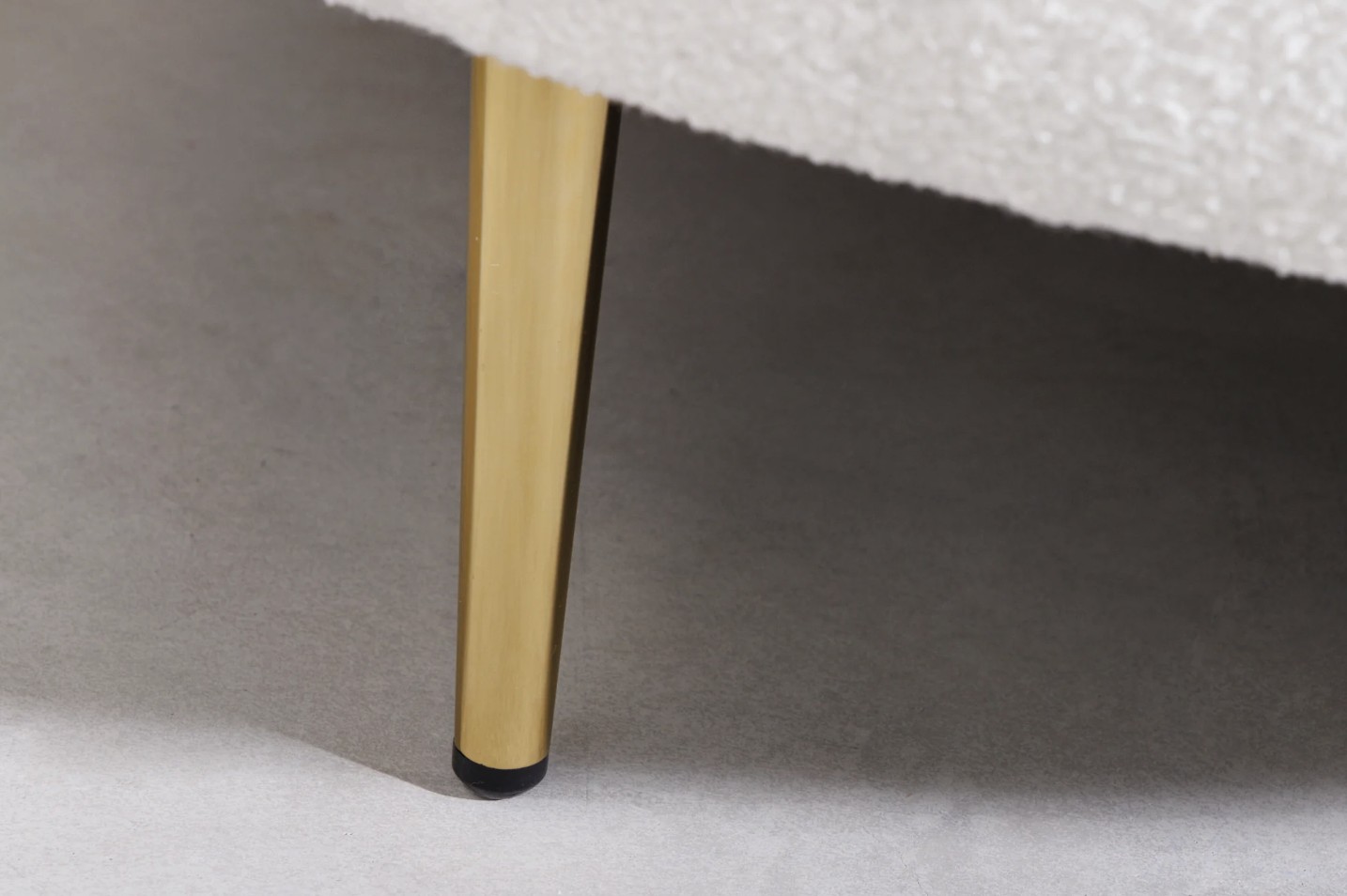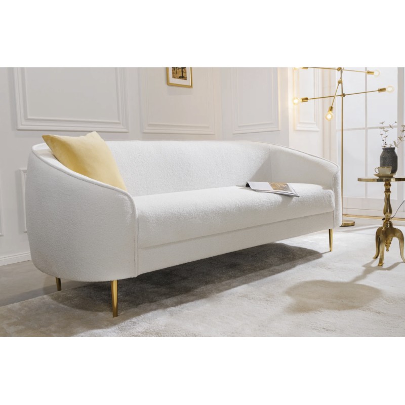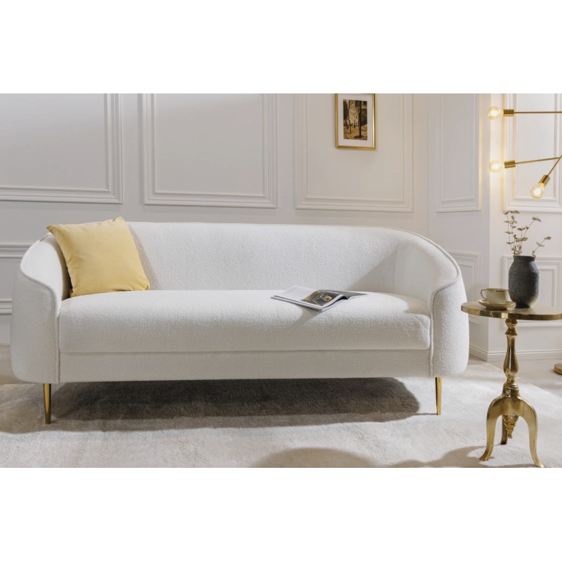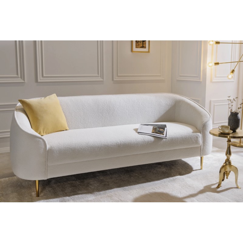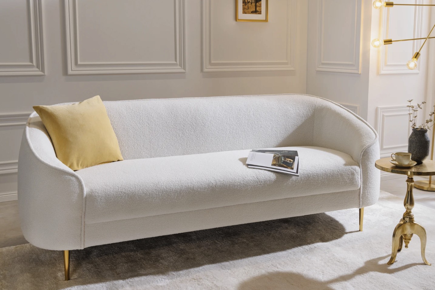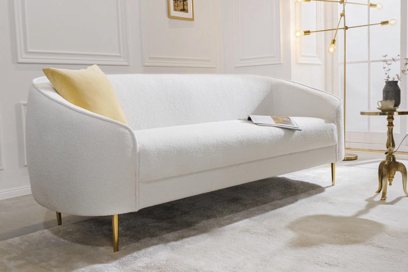 Doté d’une structure associant métal et matériaux textiles, ce canapé assure stabilité et durabilité. Son revêtement en tissu bouclette offre un toucher doux et un rendu visuel raffiné. Les accoudoirs intégrés renforcent le confort d’assise, tandis que les pieds en métal aspect doré apportent une touche élégante et lumineuse à l’ensemble.