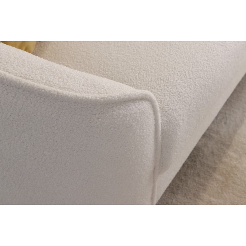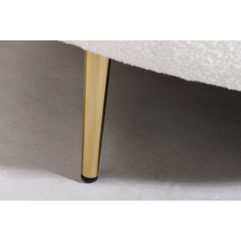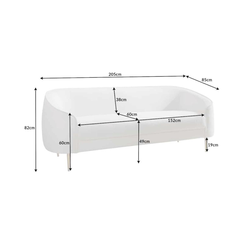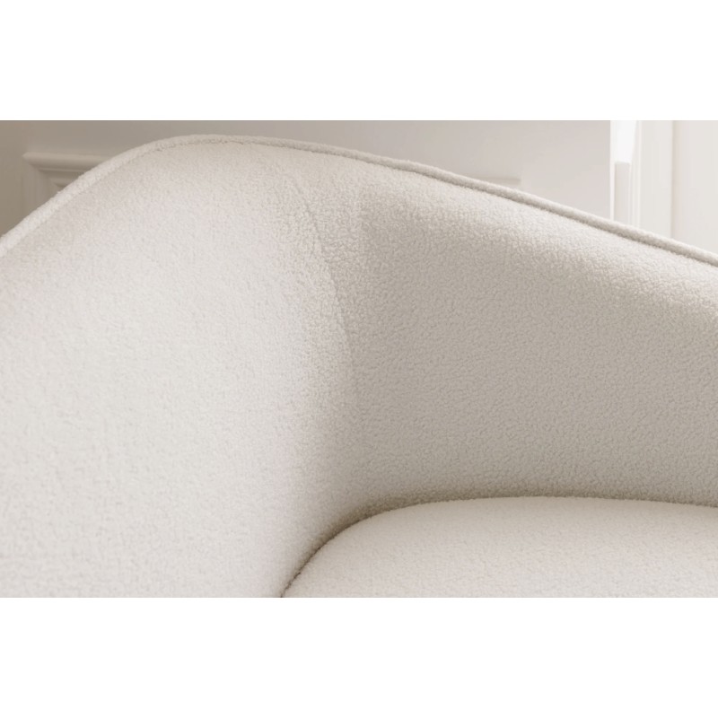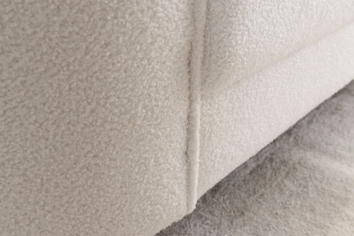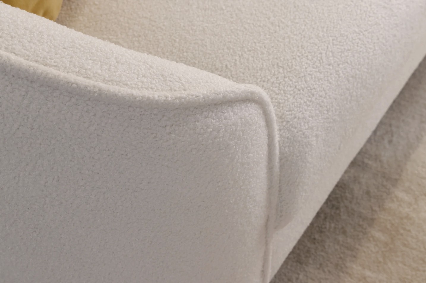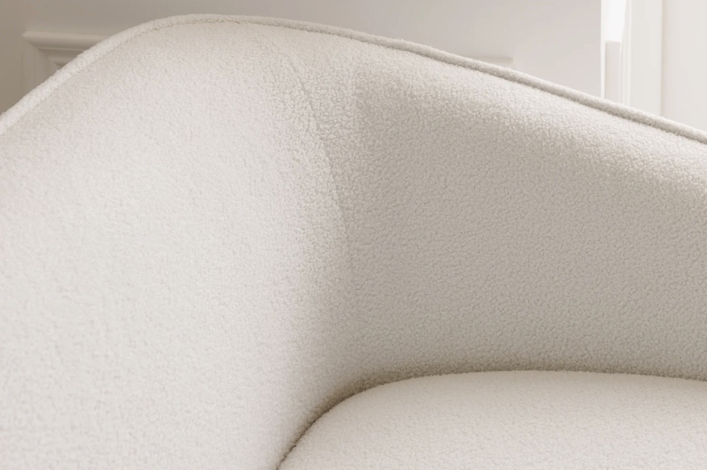Doté d’une structure associant métal et matériaux textiles, ce canapé assure stabilité et durabilité. Son revêtement en tissu bouclette offre un toucher doux et un rendu visuel raffiné. Les accoudoirs intégrés renforcent le confort d’assise, tandis que les pieds en métal aspect doré apportent une touche élégante et lumineuse à l’ensemble.