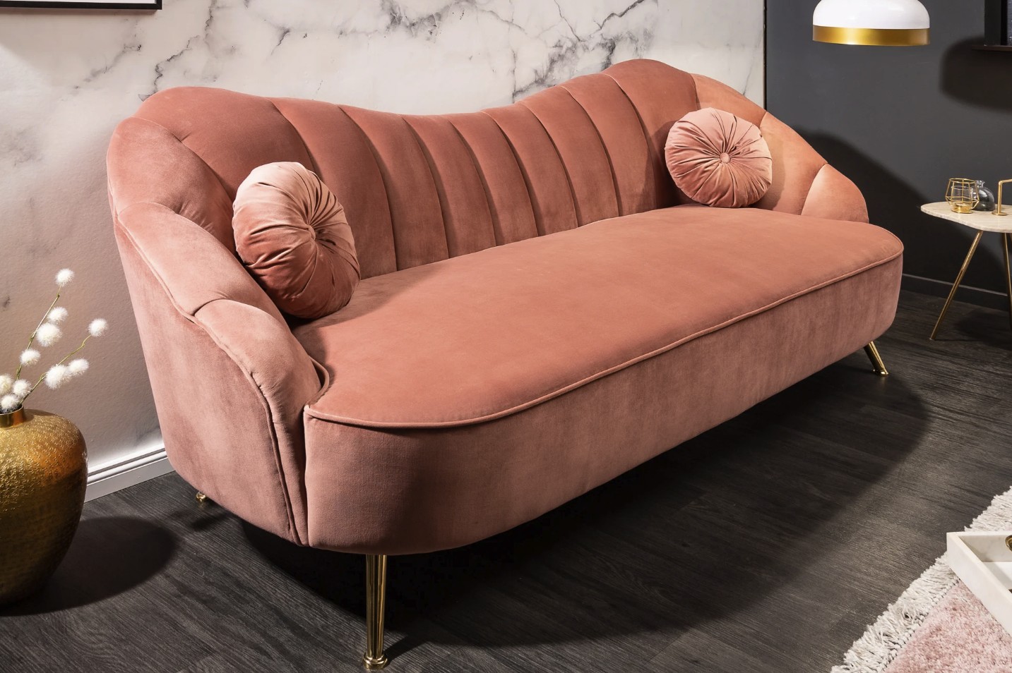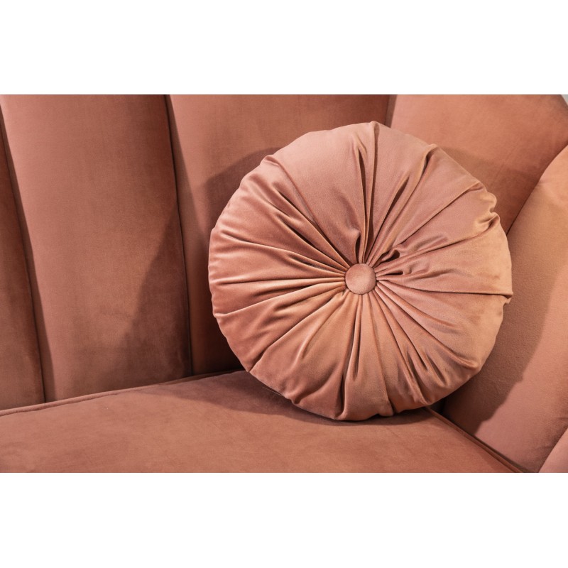 Doté d’un revêtement en velours doux, ce canapé offre une assise agréable et accueillante pour un usage quotidien. Sa structure en bois de pin massif garantit solidité et durabilité, tandis que ses pieds en acier aspect doré soulignent son caractère chic et contemporain. Ce modèle est livré avec 2 coussins ronds inclus, venant compléter son allure raffinée.