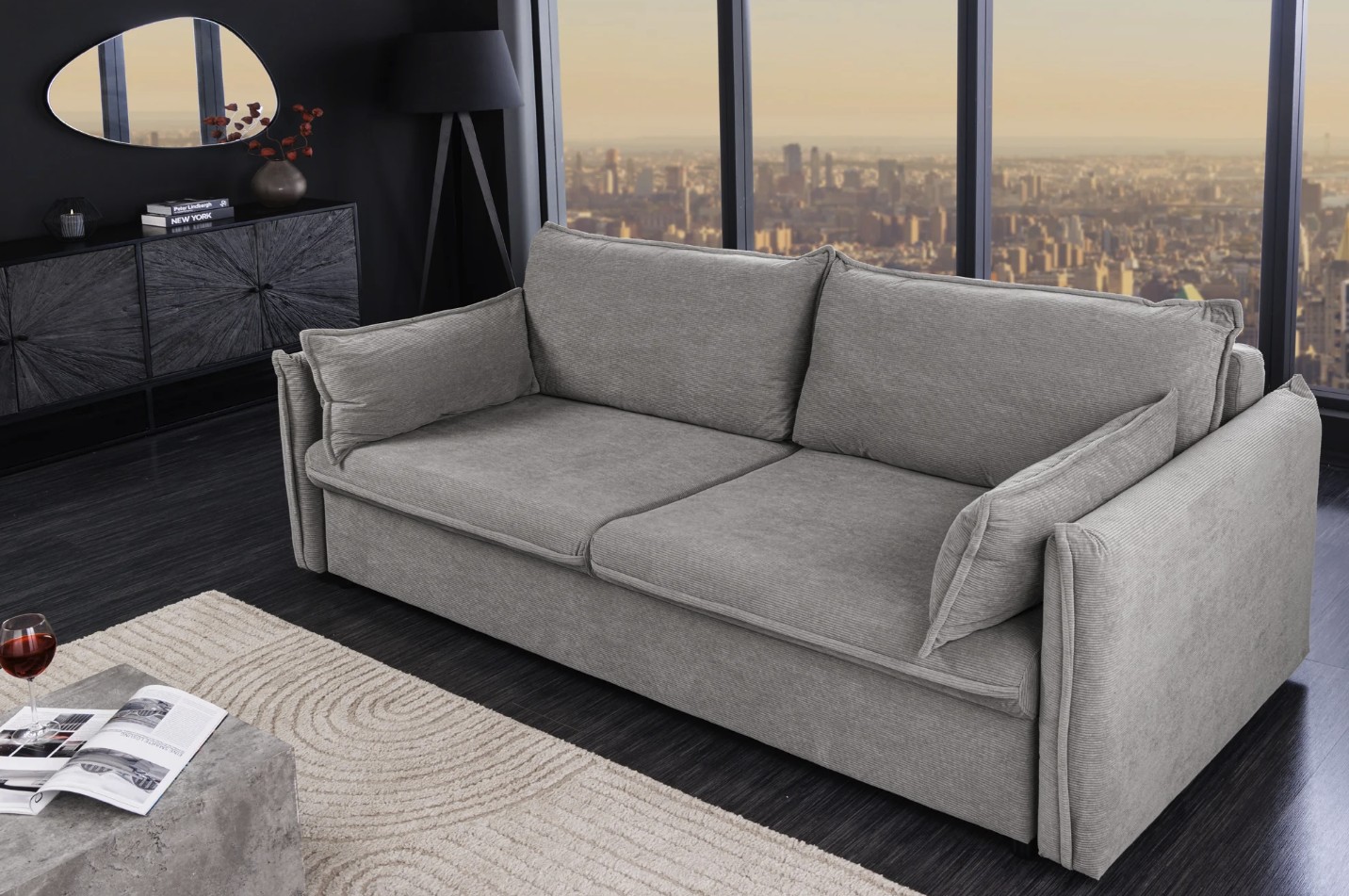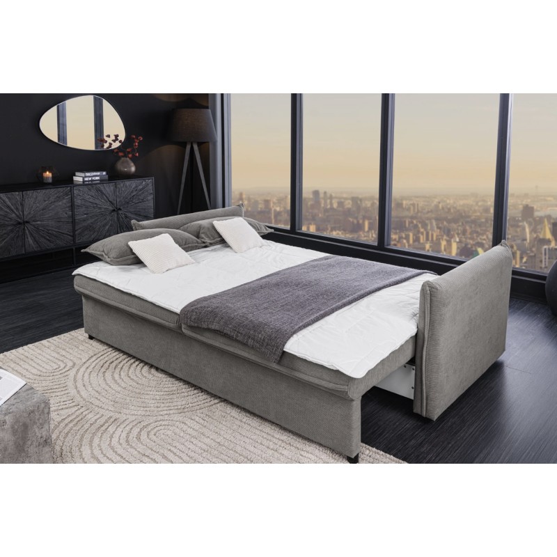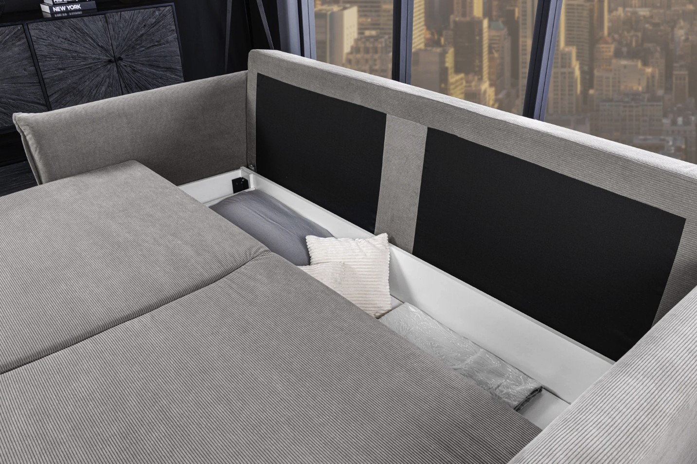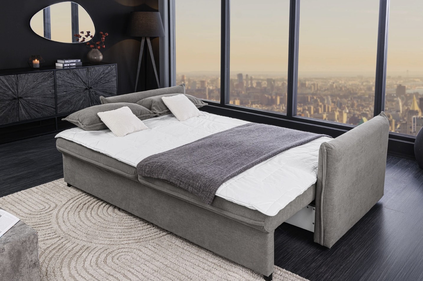 Le coffre de rangement intégré permet de stocker couettes, oreillers ou plaids en toute simplicité, tandis que le mécanisme de conversion transforme rapidement le canapé en un couchage spacieux et confortable.