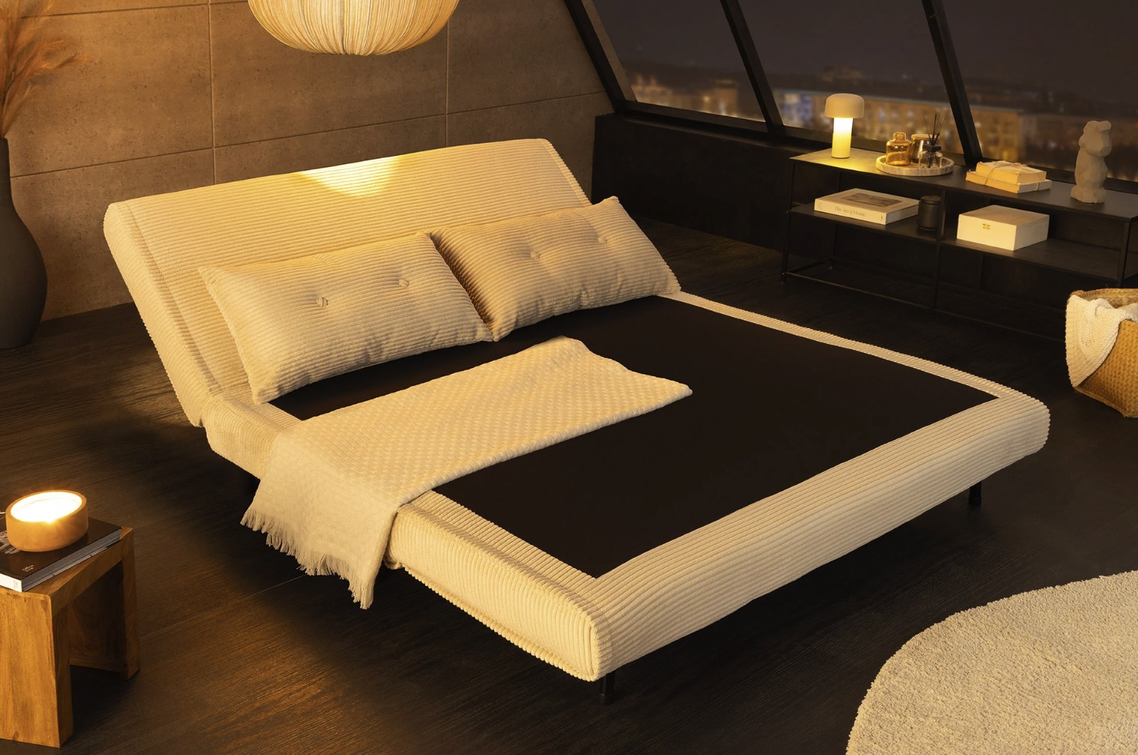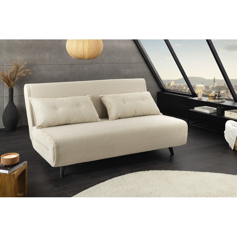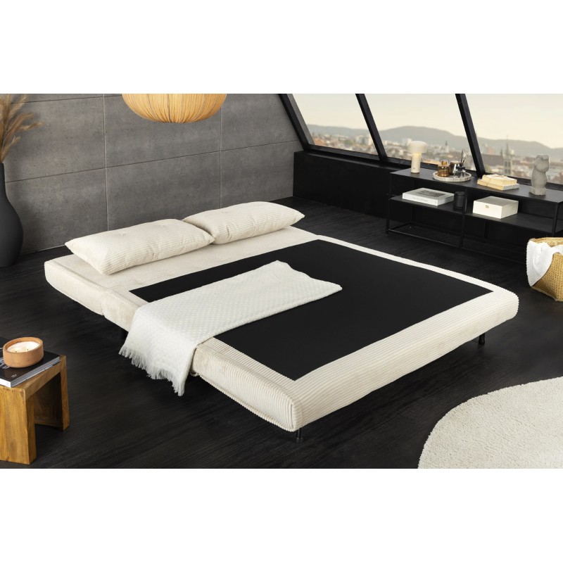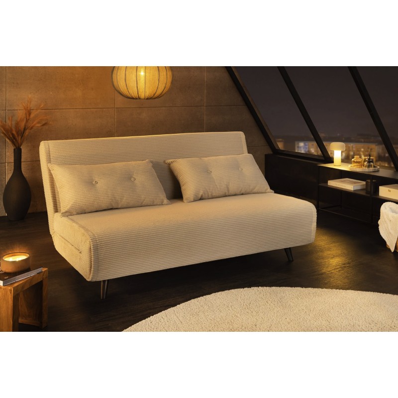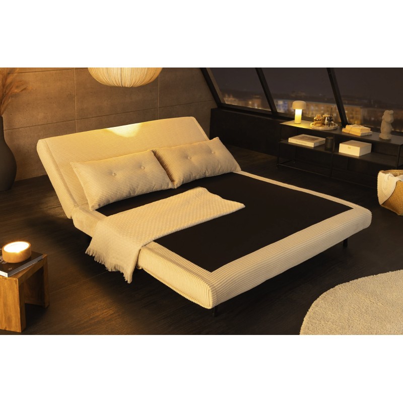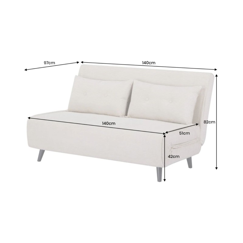 Grâce à son système de conversion simple, ce canapé se transforme rapidement en lit confortable offrant un couchage de 140 × 190 cm. Son revêtement côtelé, composé de 90 % polyester et 10 % nylon, apporte une texture agréable et une bonne tenue dans le temps.
