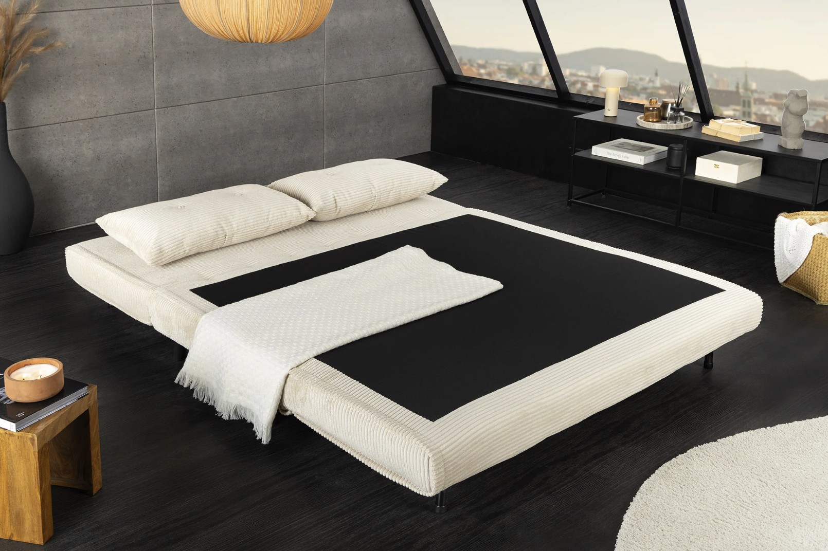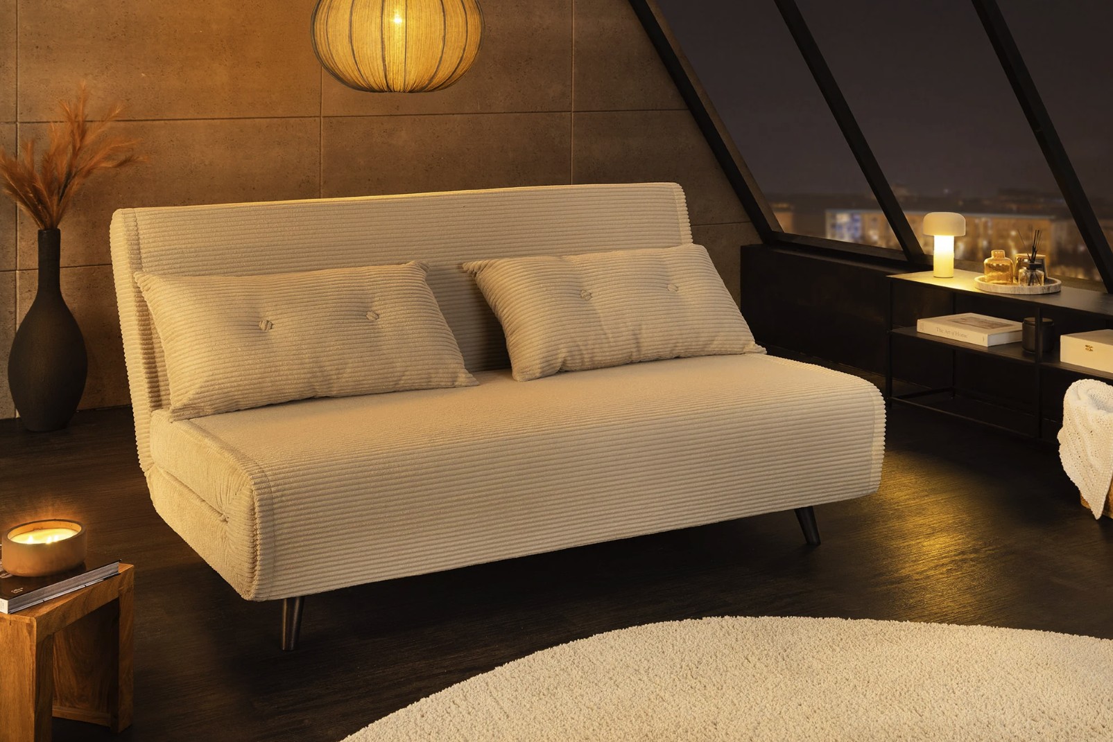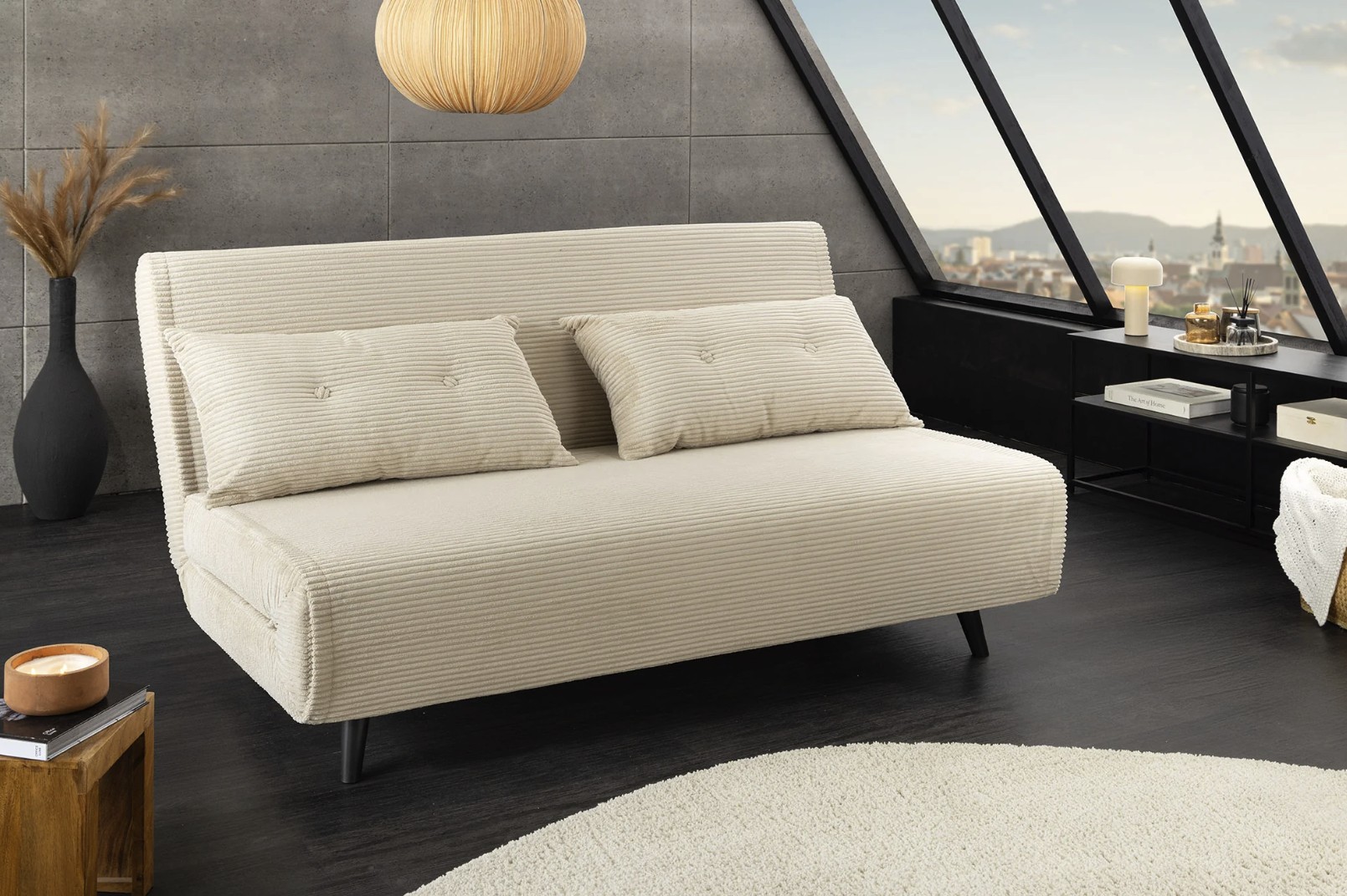Grâce à son système de conversion simple, ce canapé se transforme rapidement en lit confortable offrant un couchage de 140 × 190 cm. Son revêtement côtelé, composé de 90 % polyester et 10 % nylon, apporte une texture agréable et une bonne tenue dans le temps.