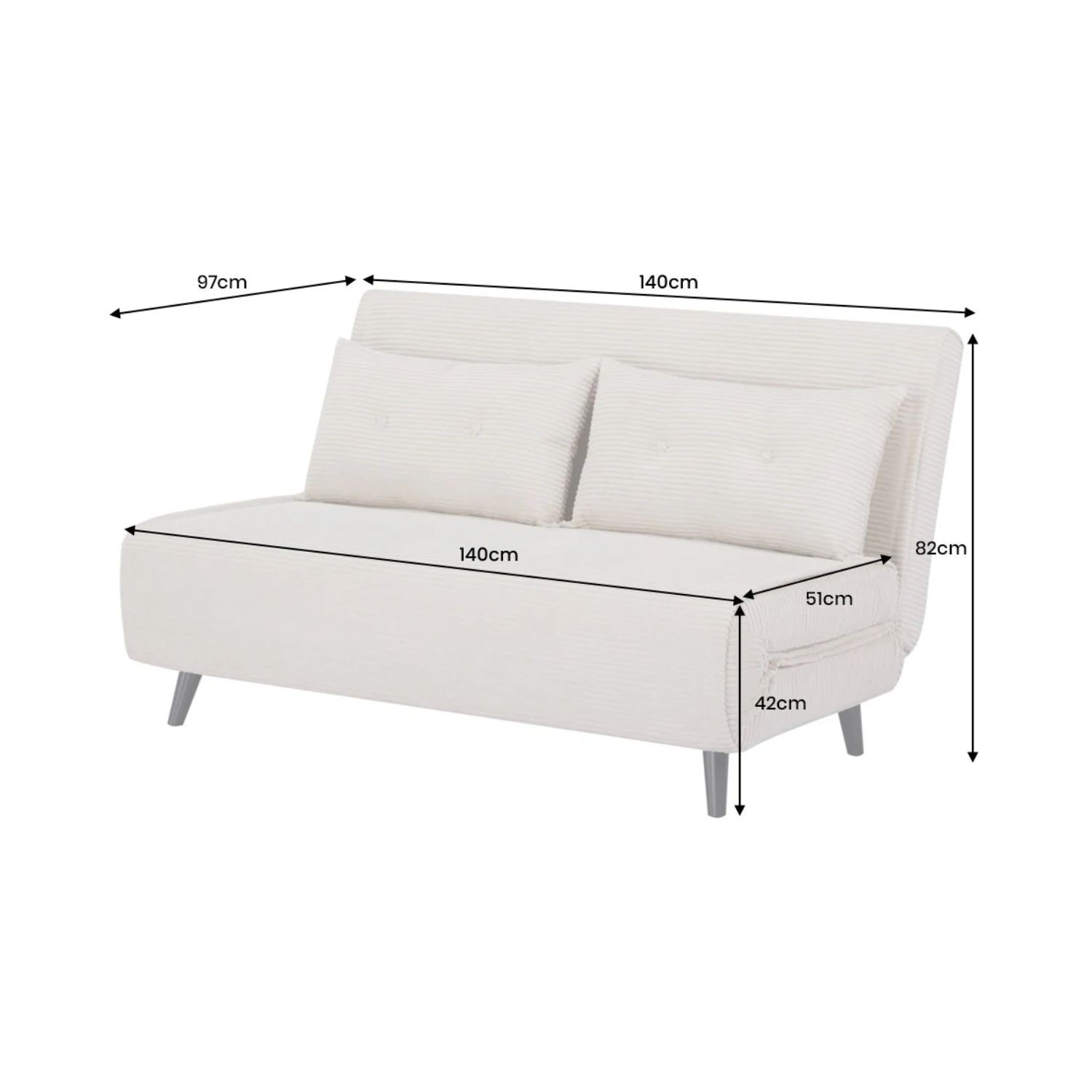 Les pieds en bois de pin vernis assurent stabilité et solidité au quotidien. Les deux coussins inclus complètent l’ensemble pour un confort optimal, aussi bien en position assise qu’en mode couchage.