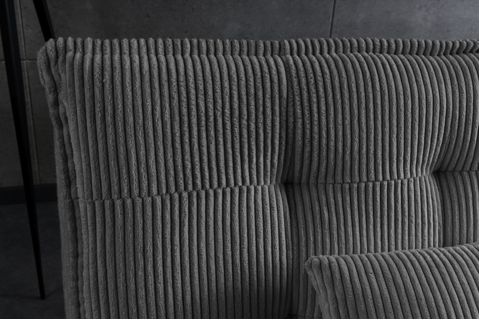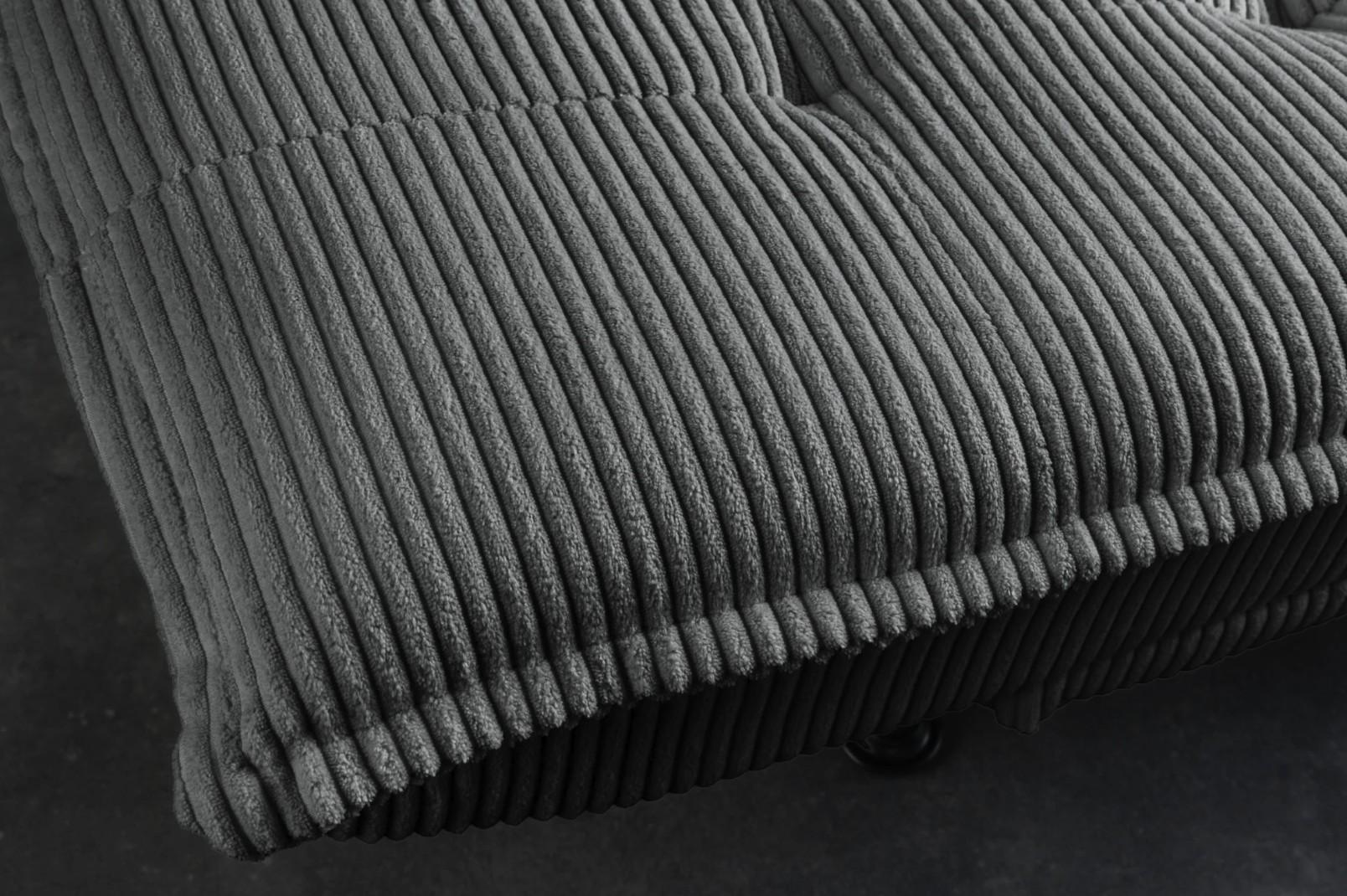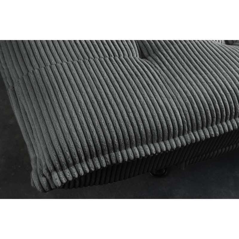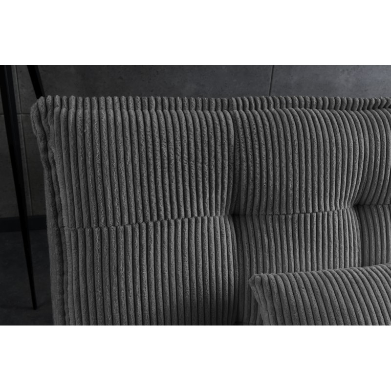 Son revêtement en velours côtelé apporte du relief et une sensation douce au toucher, tandis que son garnissage en mousse assure une assise agréable. La structure en bois de pin, associée à des pieds en métal noir, garantit solidité et stabilité dans le temps.