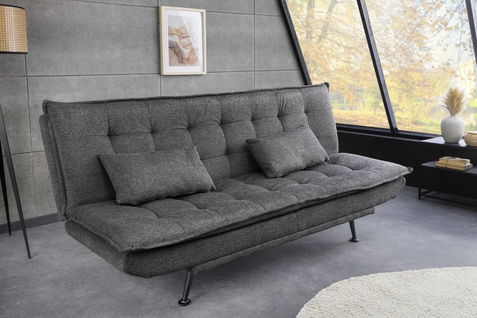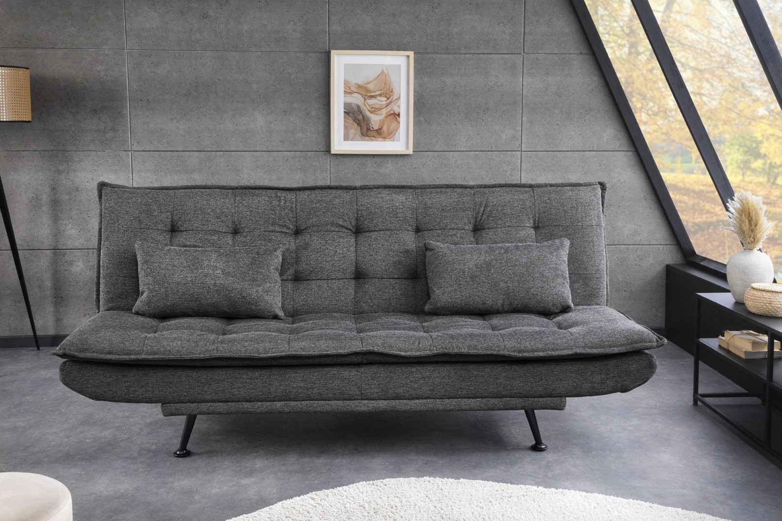 Le canapé droit SERENO en gris foncé avec revêtement en tissu texturé offre une alternative moderne aux matières classiques. Son rendu visuel subtil apporte de la profondeur à la décoration tout en restant facile à associer dans un salon contemporain.