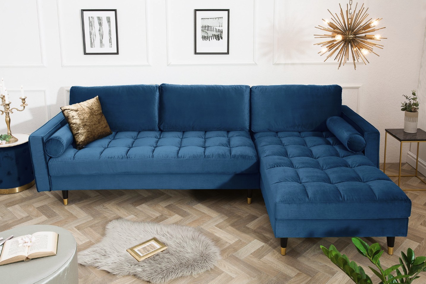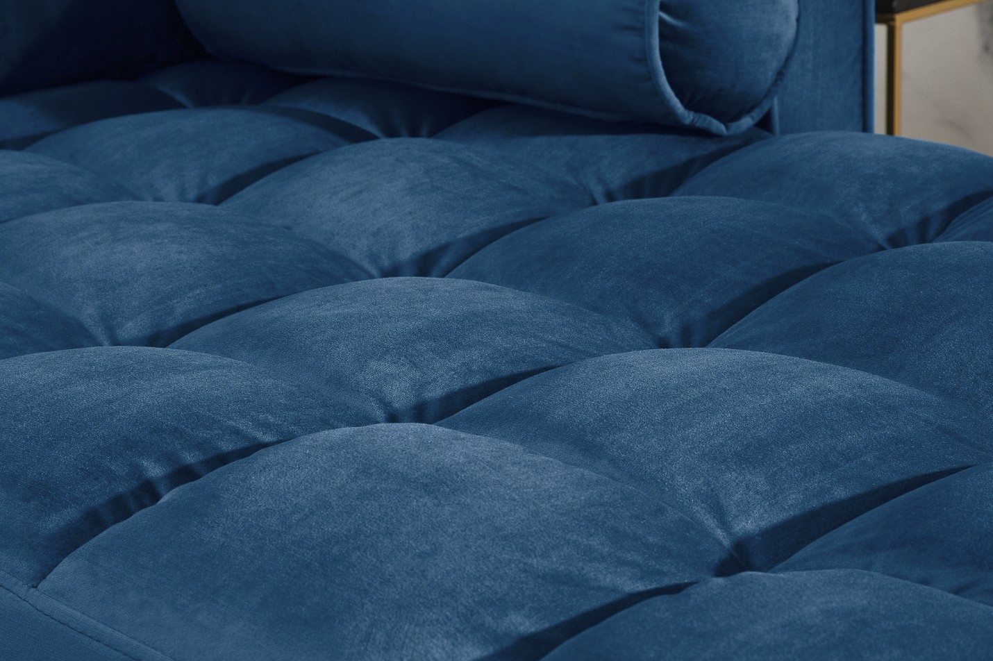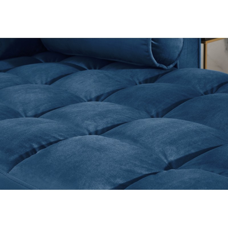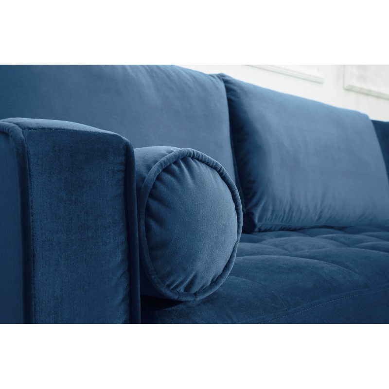 Ce canapé repose sur une structure en bois massif associée à des éléments en métal, offrant une excellente stabilité et une grande longévité. Son revêtement en velours polyester met en valeur la profondeur du coloris bleu, tandis que la finition matelassée appliquée uniquement sur l’assise assure un confort appréciable au quotidien. Les accoudoirs intégrés et la têtière incluse renforcent l’ergonomie et le maintien.