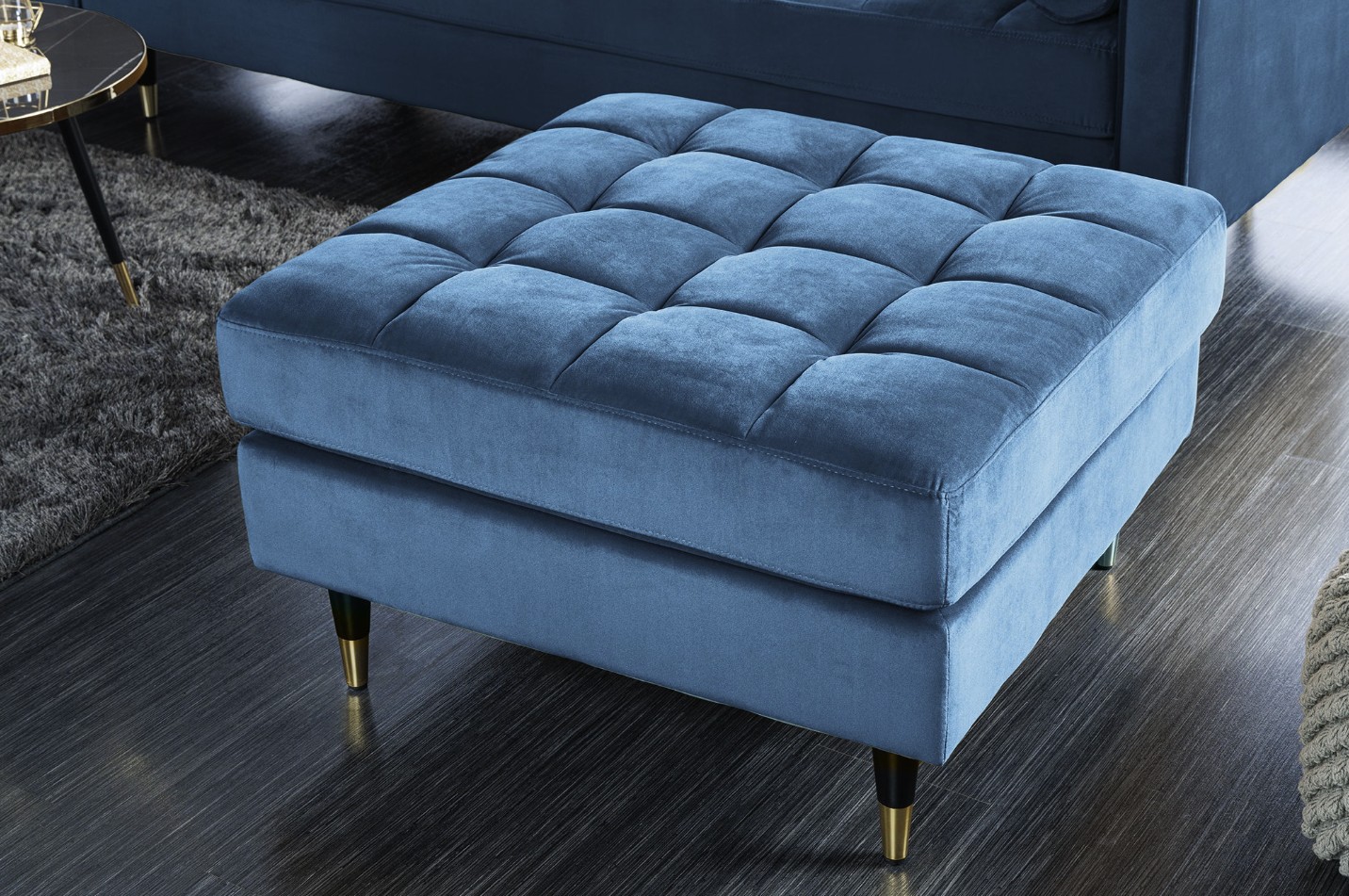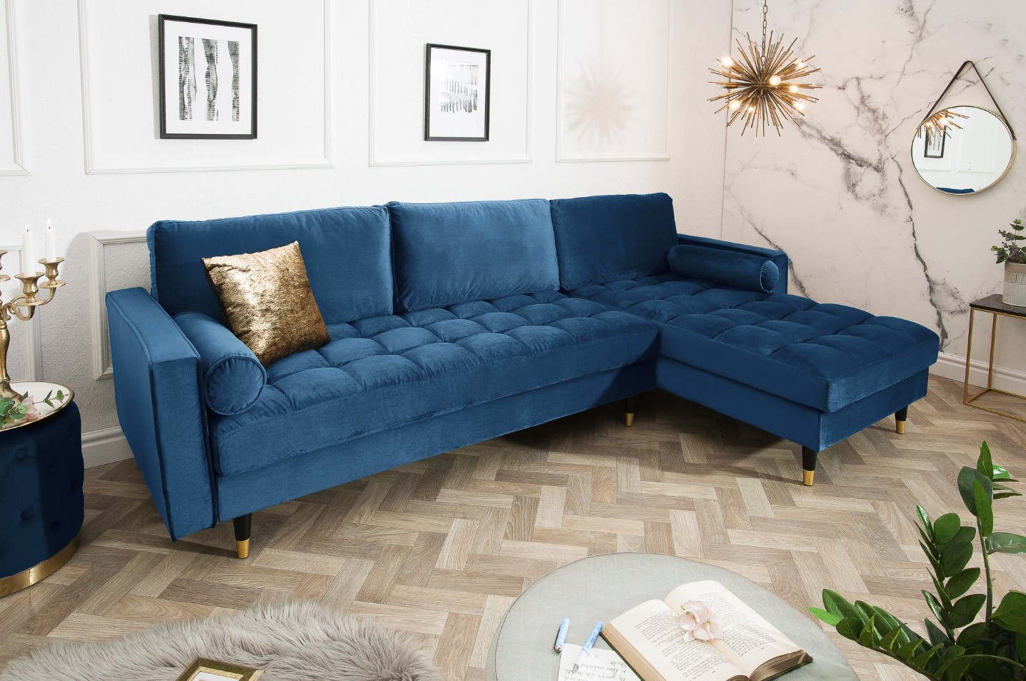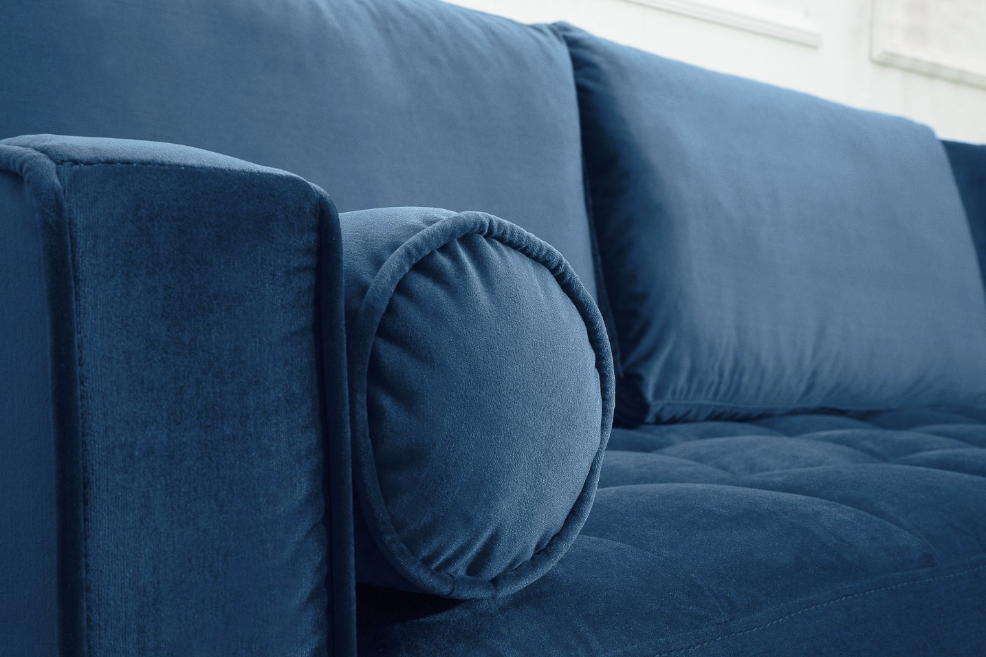 Ce canapé repose sur une structure en bois massif associée à des éléments en métal, offrant une excellente stabilité et une grande longévité. Son revêtement en velours polyester met en valeur la profondeur du coloris bleu, tandis que la finition matelassée appliquée uniquement sur l’assise assure un confort appréciable au quotidien. Les accoudoirs intégrés et la têtière incluse renforcent l’ergonomie et le maintien.