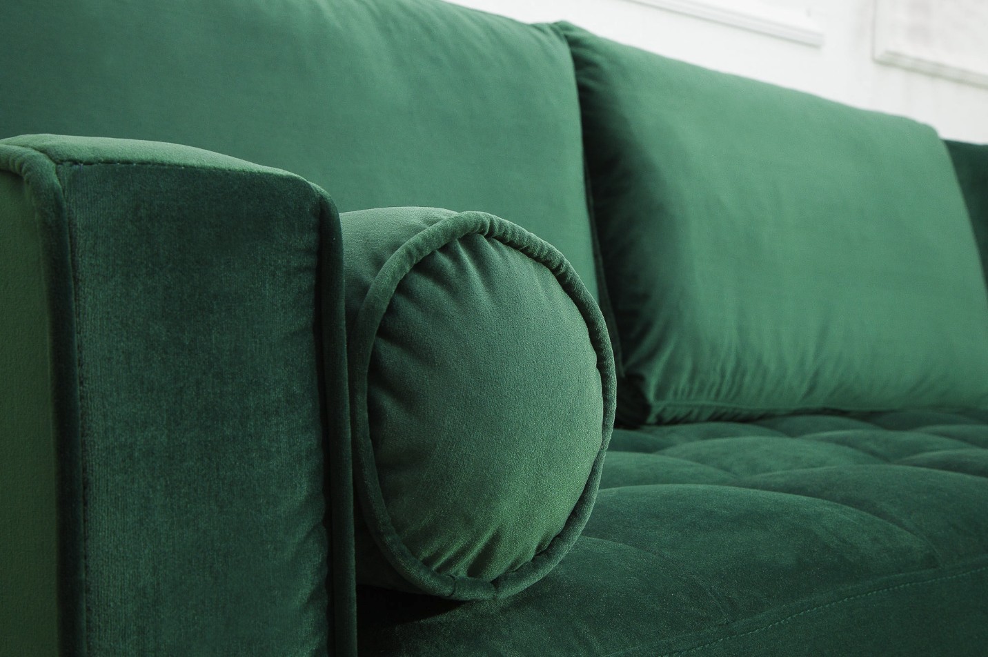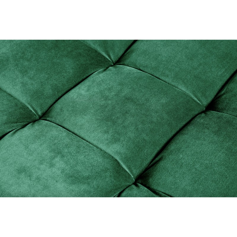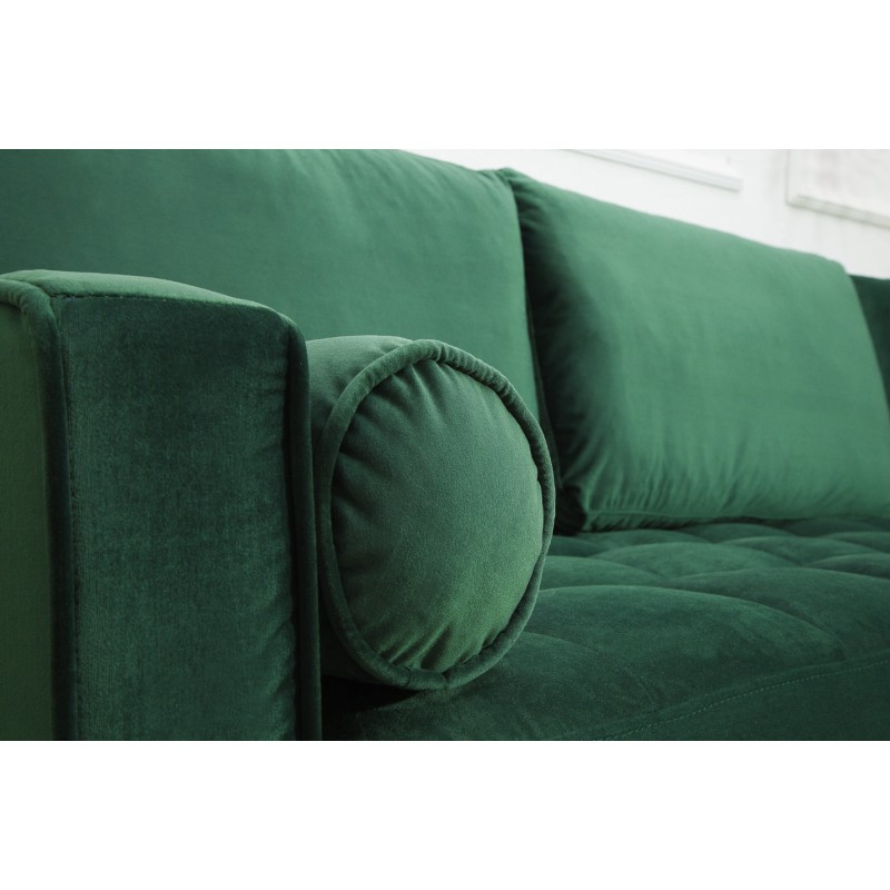 Ce canapé est conçu avec une structure en bois massif complétée par des éléments en métal, assurant solidité et stabilité dans le temps. Son revêtement en velours polyester met en valeur l’intensité du coloris vert émeraude, tandis que la finition matelassée appliquée uniquement sur l’assise offre un confort appréciable au quotidien. Les accoudoirs intégrés et la têtière incluse participent à une assise équilibrée et agréable.