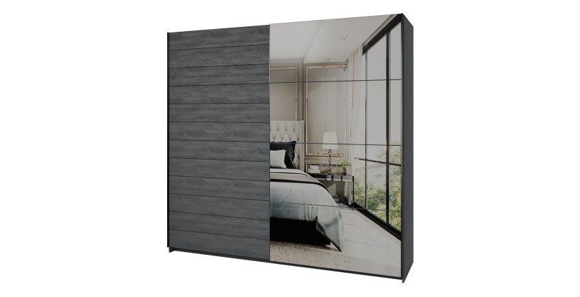 - CARACTÉRISTIQUES : Chevets composé de trois tiroirs. Lit design 160x200 avec tiroirs au bout du lit et niches sur les côtés du lits. Sommier inclus, Armoire avec 2 portes coulissantes dont une avec un grand miroir. Commode avec 2 portes et 4 tiroirs.