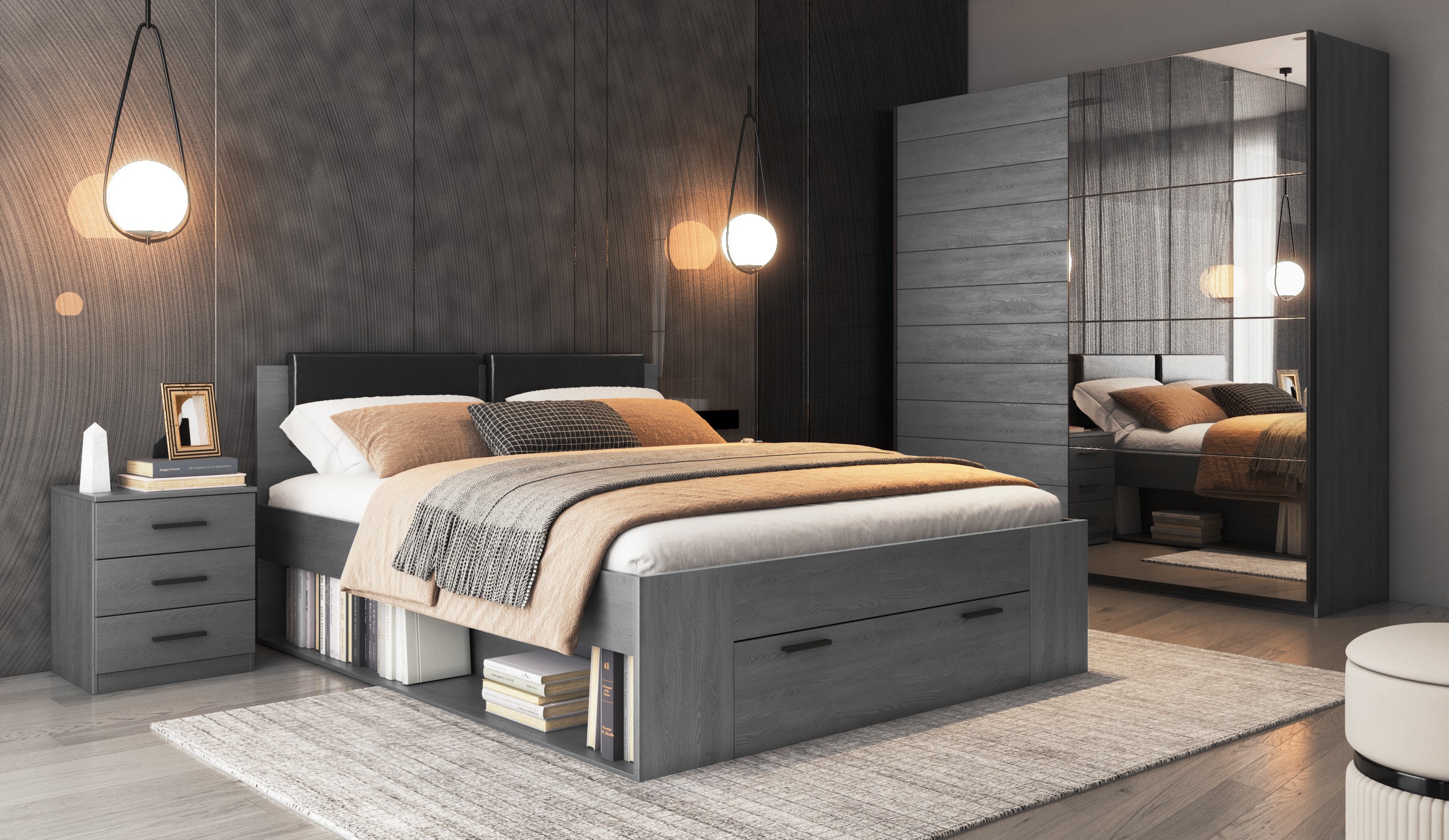 - MODELE : Chambre complète FLOYD composée d'un lit avec tiroirs, d'une armoire, d'une commode, de deux chevets et d'un sommier 160x200