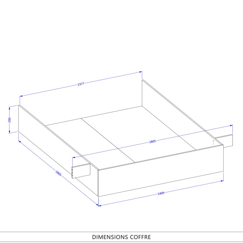 - CARACTÉRISTIQUES : Chevets composé d'un grand tiroir. Lit coffre 180x200 avec sommier inclus, Armoire avec 4 portes battantes et 2 tiroirs. Commode avec 3 grands tiroirs.