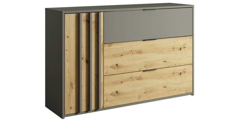 Organisez facilement vos vêtements et accessoires avec cette commode à 3 tiroirs et 1 porte. Son design moderne en chêne clair et gris anthracite s'harmonise parfaitement avec les autres meubles de la collection IZO. Robuste et pratique, elle est idéale pour ranger vos affaires tout en ajoutant une touche de style à votre chambre.
