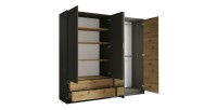 Cette armoire spacieuse de 220 cm est idéale pour organiser vos vêtements et accessoires. Elle est équipée de 4 portes, dont deux avec miroir intégré, et de 2 tiroirs pour un rangement supplémentaire. Sa finition en gris graphite et chêne clair apporte une touche de modernité et d'élégance à votre chambre.
