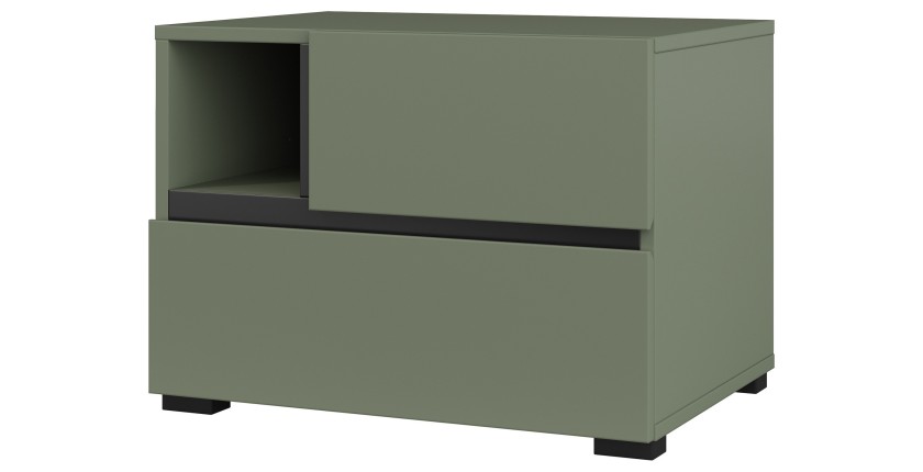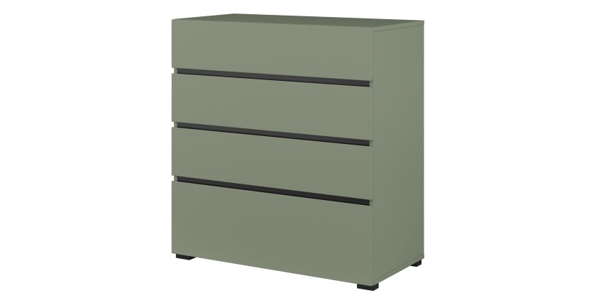 Offrez-vous une chambre fonctionnelle et élégante avec ce pack HAVANA complet en coloris vert sauge et noir. Il comprend un lit coffre 160x200 cm avec sommier relevable, deux tables de chevet, une armoire 4 portes avec penderie et étagères ainsi qu’une commode 4 tiroirs. Ce mobilier raffiné affiche un design moderne avec des lignes sobres et un contraste équilibré entre vert sauge doux et noir mat.