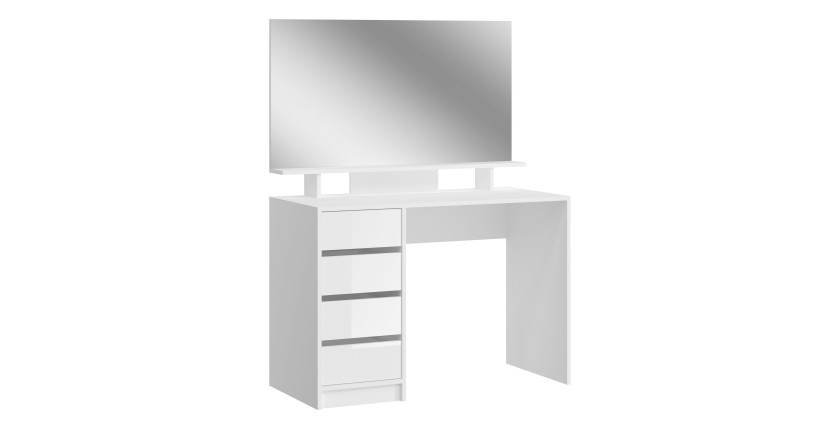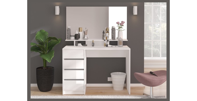 La coiffeuse intègre 4 tiroirs de rangement latéraux, dont un compartiment avec une niche ouverte en bas, idéal pour les objets du quotidien. Sa finition blanche laquée reflète la lumière et s’adapte facilement à tout type de décoration.