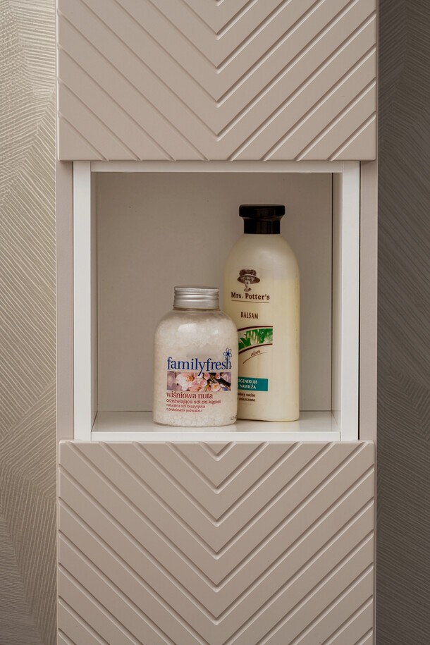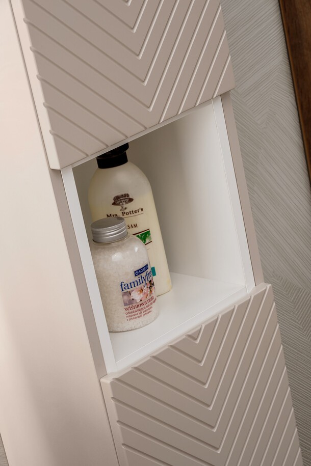 Les façades sont sublimées par de délicats motifs en chevron, ajoutant une dimension raffinée et texturée à l’ensemble. Ce design discret mais sophistiqué se marie parfaitement avec les teintes naturelles et les matériaux bruts d’une salle de bain moderne.