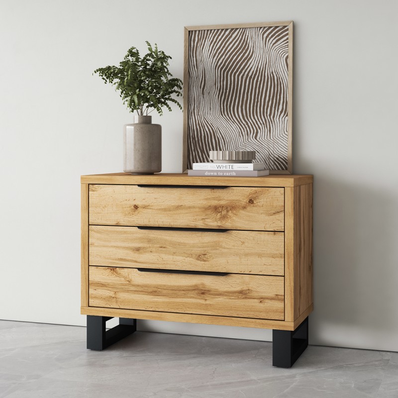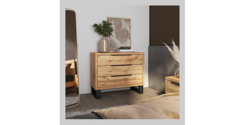 Adoptez la commode MILOS, un meuble de rangement inspiré du style industriel qui combine praticité et design. Ses 3 grands tiroirs en finition chêne brut et ses pieds design noir lui confèrent une allure moderne et tendance.