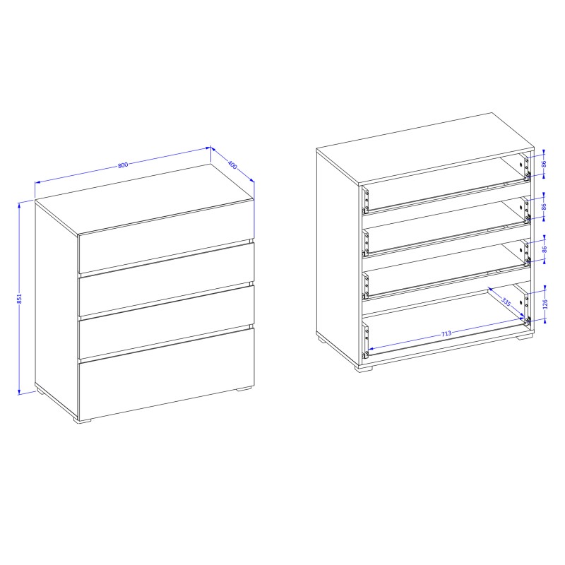 Fabriquée en panneaux de particules de première qualité, cette commode repose sur 5 pieds noirs discrets qui assurent stabilité et légèreté visuelle. Les tiroirs sont montés sur glissières à roulettes pour une ouverture fluide et durable, tandis que les poignées sont directement intégrées dans les façades pour un rendu épuré.