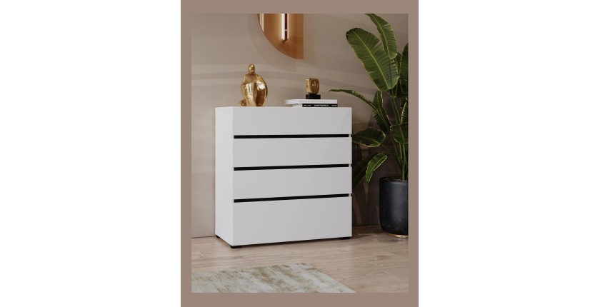 Apportez une touche élégante et moderne à votre intérieur avec la commode HAVANA en coloris blanc et noir. Conçue pour optimiser votre espace, elle dispose de 4 tiroirs spacieux pour ranger efficacement vos vêtements, accessoires ou documents.