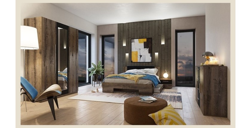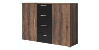 Commode 2 portes et 4 tiroirs 130cm. Collection IRINA imitation chêne foncé et noir