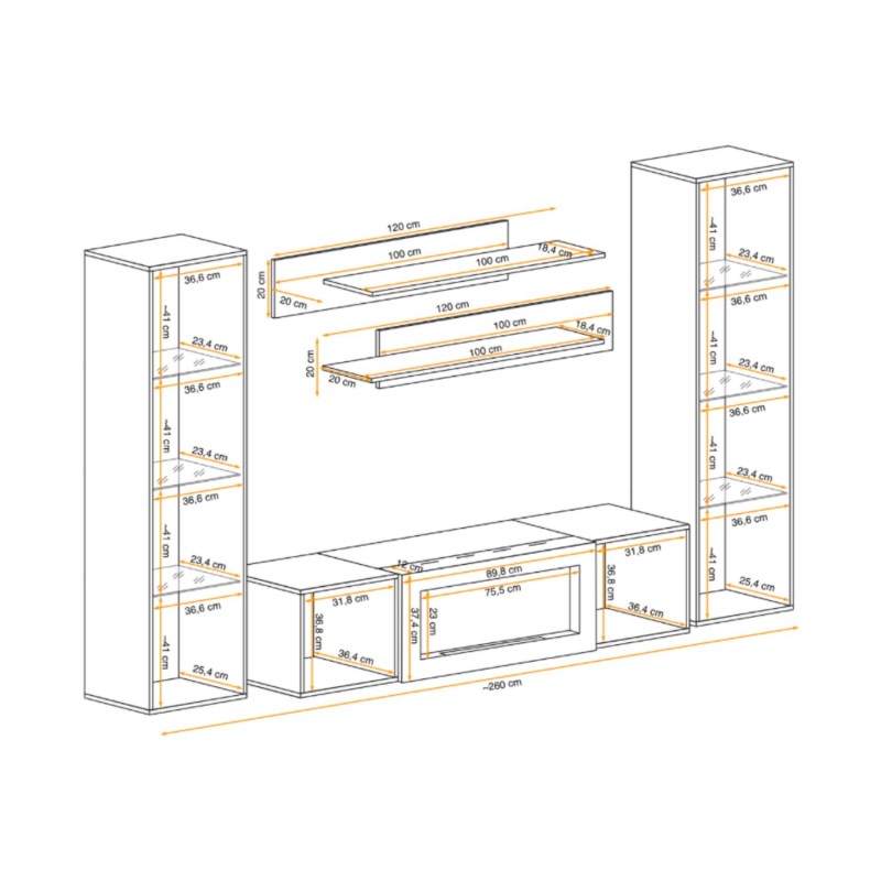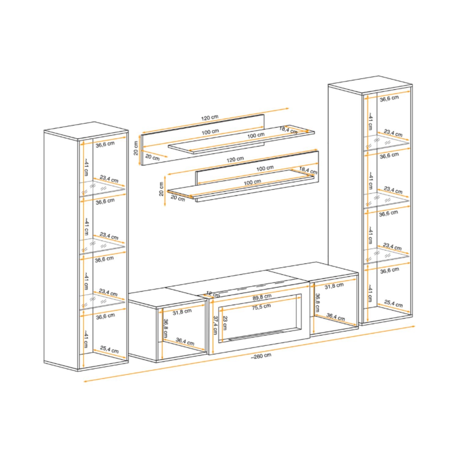 Ce meuble mural inclut 2 vitrines vitrées (40x170x29 cm chacune) avec 3 étagères en verre, un meuble TV (160x40x40 cm) avec cheminée bio-éthanol intégrée au centre, et 2 étagères murales (120x20x20 cm et 100x20x20 cm). Chaque élément est conçu pour optimiser le rangement tout en valorisant vos objets déco.