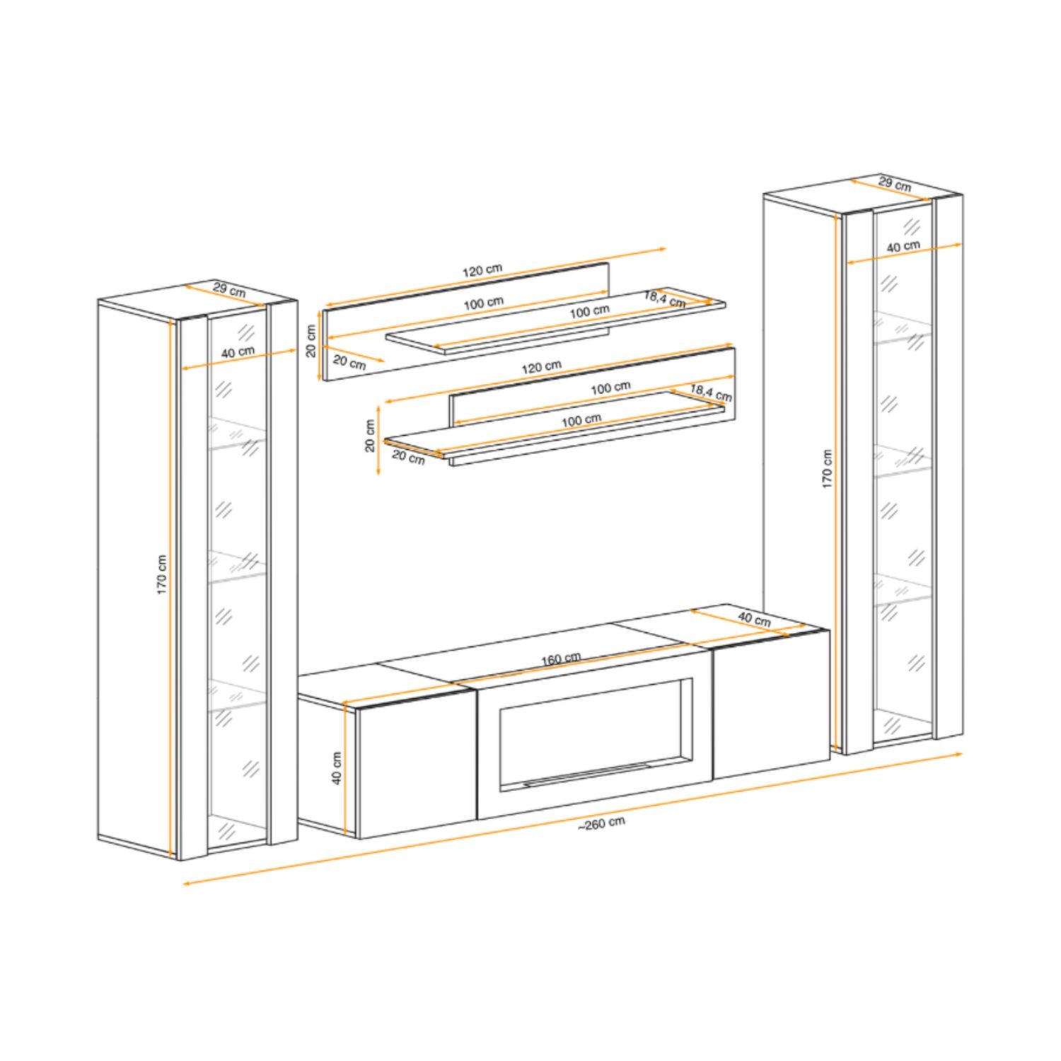 Dimensions des éléments (en cm) | 2 vitrines : 40x170x29 - 1 étagère : 120x20x20 - 1 étagère 100x20x20 - 1 meuble TV : 160x40x40 |