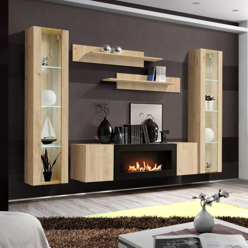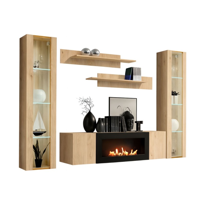 Contenu du pack | 2 vitrines vitrées, 2 étagères et 1 meuble TV avec cheminée bio-éthanol |