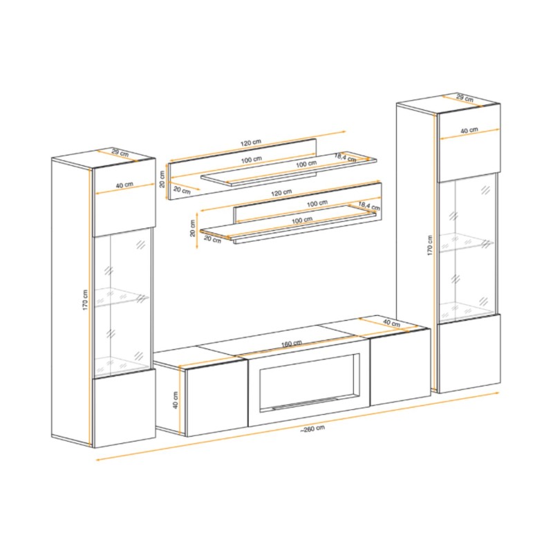 Dimensions des éléments (en cm) | 2 vitrines : 40x170x29 - 1 étagère : 120x20x20 - 1 étagère 100x20x20 - 1 meuble TV : 160x40x40 |