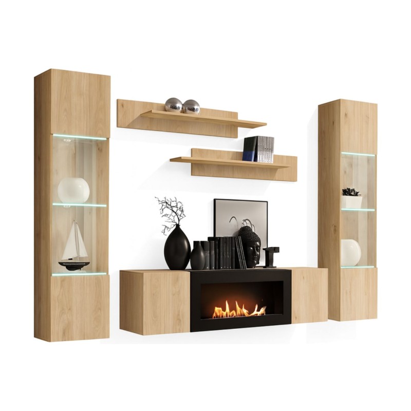 Contenu du pack | 2 vitrines partiellement vitrées, 2 étagères et 1 meuble TV avec cheminée bio-éthanol |