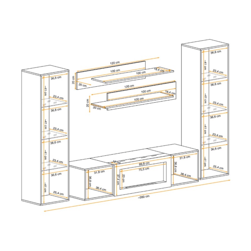 La composition comprend 2 vitrines suspendues (40x170x29 cm chacune) équipées de 3 étagères en verre, un meuble TV (160x40x40 cm) avec rangements latéraux et cheminée bio-éthanol centrale, ainsi que 2 étagères murales (120x20x20 cm et 100x20x20 cm). Idéale pour optimiser l’espace tout en créant une ambiance raffinée.