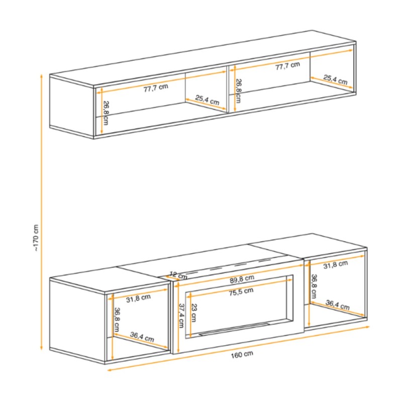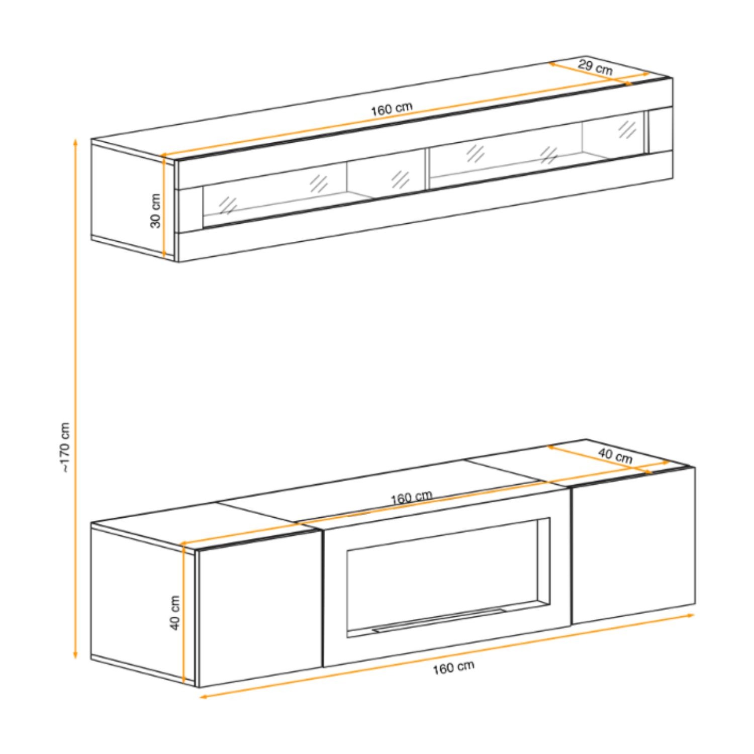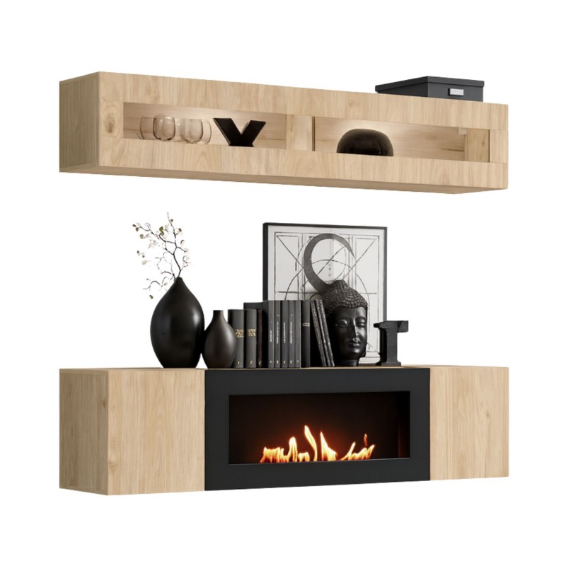 Dimensions des éléments (en cm) | Vitrine horizontale : 160x30x29 - meuble TV avec cheminée bio-éthanol : 160x40x40 |