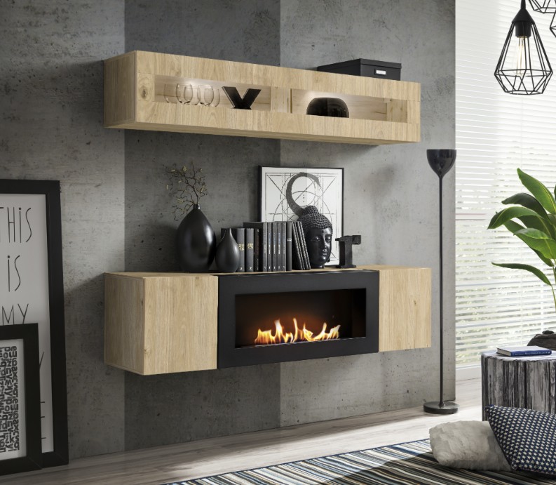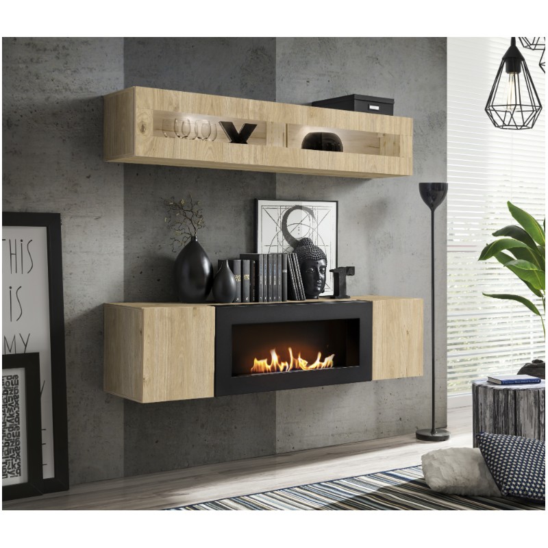 Apportez modernité et chaleur à votre salon avec la composition murale FLY. Cet ensemble associe une vitrine horizontale vitrée et un meuble TV avec cheminée bio-éthanol intégrée pour une ambiance design, cosy et fonctionnelle.