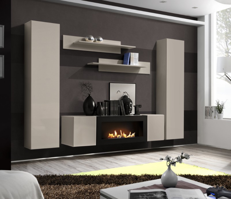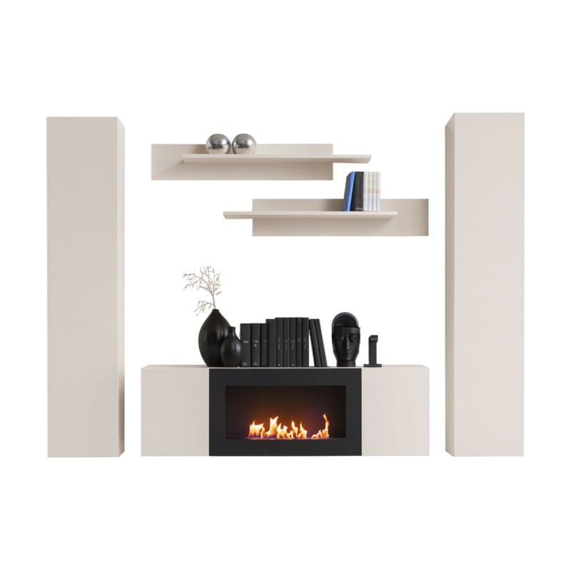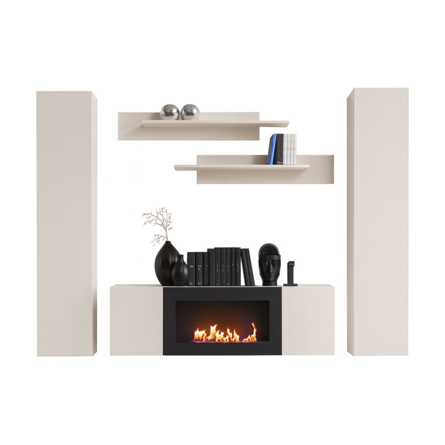 Contenu du pack | 2 colonnes suspendues, 2 étagères et 1 meuble TV avec cheminée intégrée |