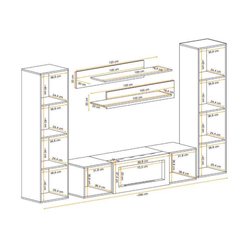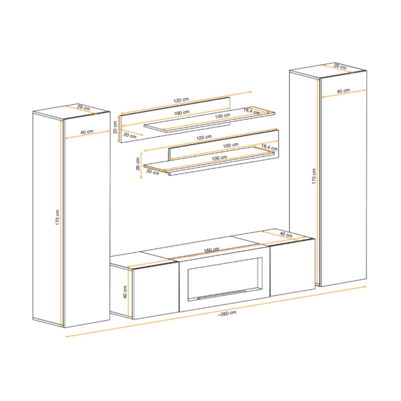 Dimensions des éléments (en cm) | 2 colonnes suspendues : 40x170x29 - 1 étagère : 120x20x20 - 1 étagère : 100x20x20 - 1 meuble TV avec cheminée : 160x40x40 |