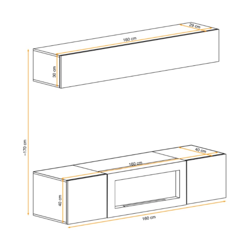 Dimensions des éléments (en cm) | Colonne suspendue horizontale : 160x30x29 - Meuble TV avec cheminée : 160x40x40 |