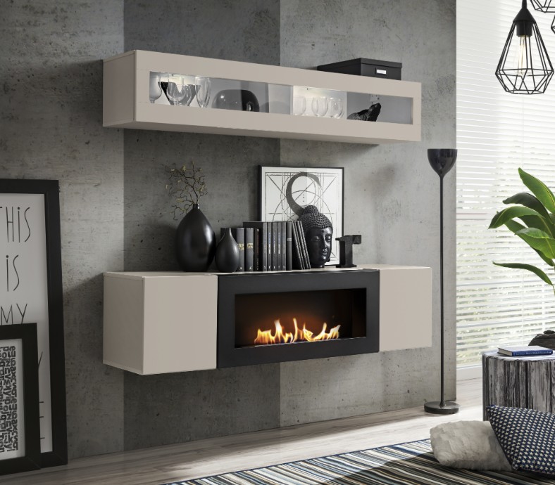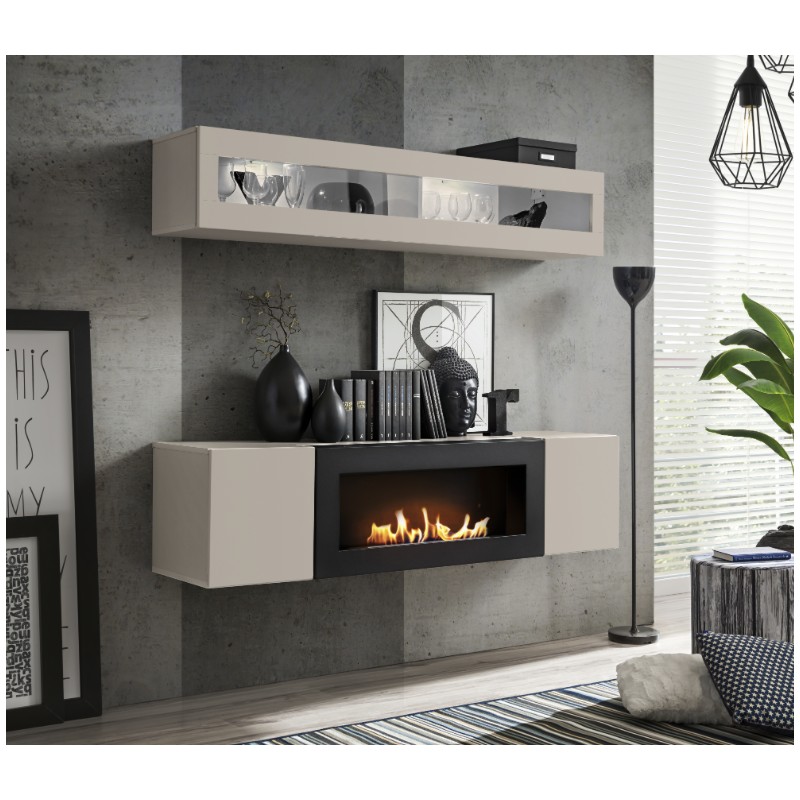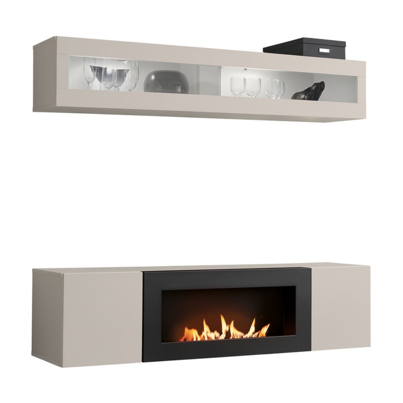 Cet ensemble associe un meuble TV équipé d’une cheminée bio-éthanol et une vitrine vitrée horizontale avec éclairage LED intégré, idéale pour créer un espace à la fois élégant et fonctionnel.