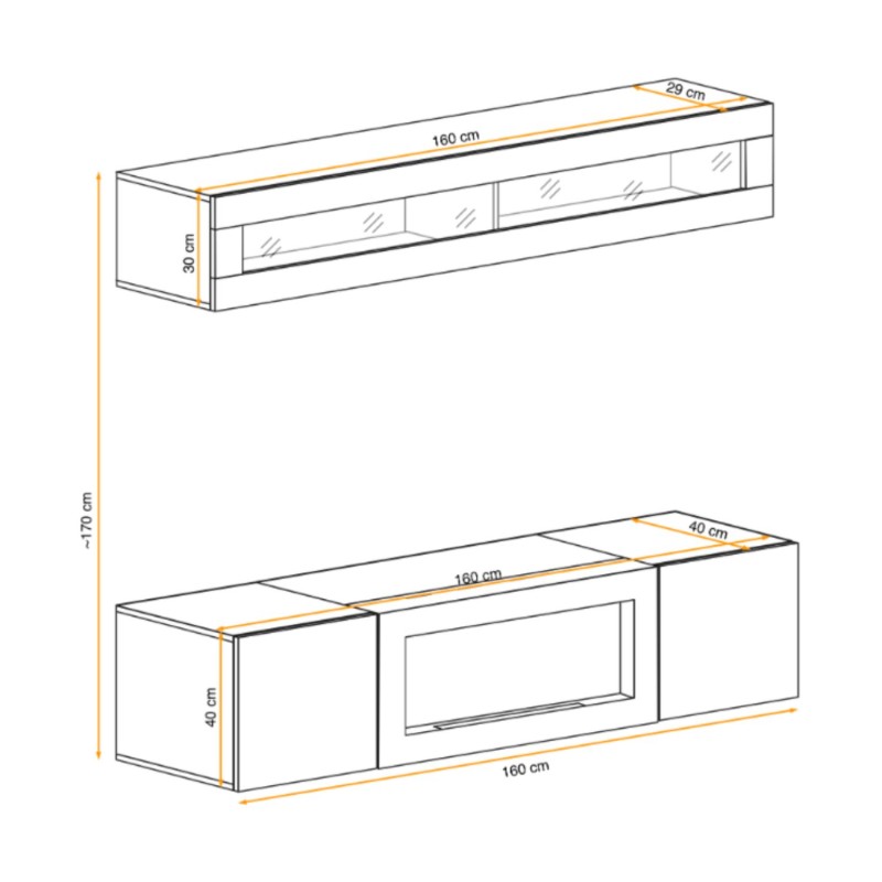 Dimensions des éléments (en cm) | Vitrine horizontale : 160x30x29 - meuble TV avec cheminée bio-éthanol : 160x40x40 |