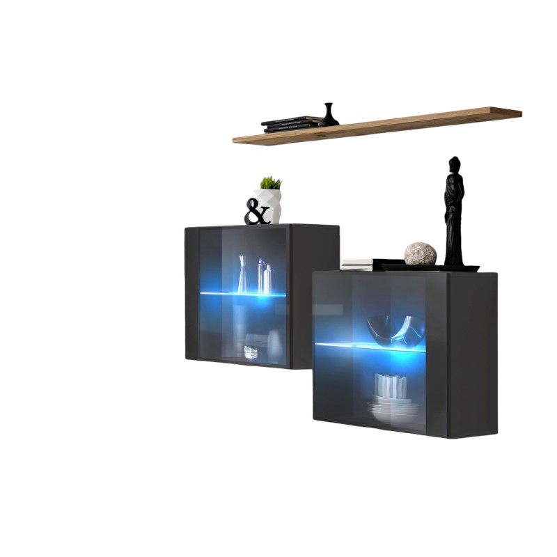 Ensemble meubles de salon composé de deux blocs "cubes" avec une porte vitrée et une étagère vitrée : 60x60x30 cm, plus une étagère : 120x2,2x20 cm