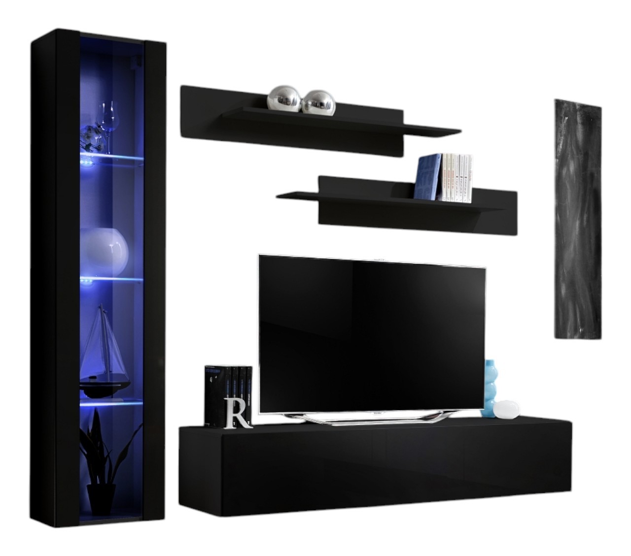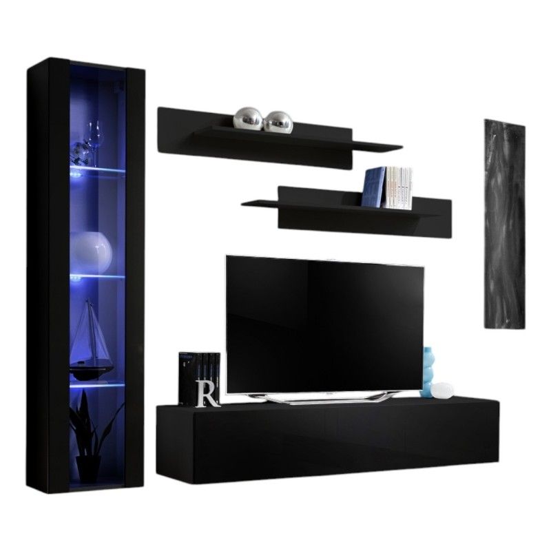 Composition murale FLY G2 – Noir brillant – Meuble TV suspendu avec colonne vitrée LED et étagères – Design moderne