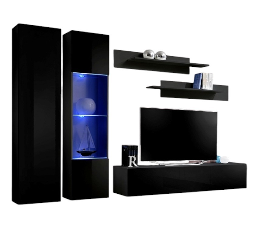 Meuble TV mural suspendu FLY A5 noir. Structure: Panneaux de particules + MDF. Composition: 1 banc TV avec 3 compartiments: 160 x 30 x 40 cm, 2 colonnes dont une vitrée avec 3 étagères chacune + LED: 40 x 170 x 29 cm, 2 étagères: 100-120 x 20 x 20 cm. Coloris: corps noir mat, façades noires brillantes. Système d'ouverture des portes PUSH TO OPEN. 18 combinaisons disponibles pour cette référence.