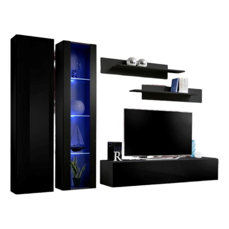 Meuble TV mural suspendu FLY A4 noir. Structure: Panneaux de particules + MDF. Composition: 1 banc TV avec 3 compartiments: 160 x 30 x 40 cm, 2 colonnes dont une vitrée avec 3 étagères chacune + LED: 40 x 170 x 29 cm, 2 étagères: 100-120 x 20 x 20 cm. Coloris: corps noir mat, façades noires brillantes. Système d'ouverture des portes PUSH TO OPEN. 18 combinaisons disponibles pour cette référence.
