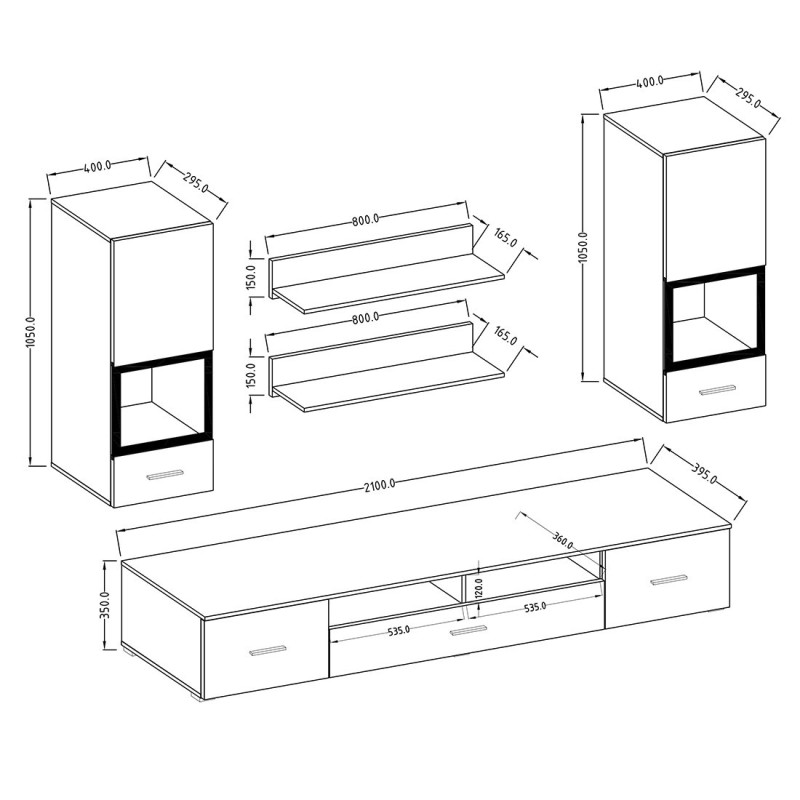 | Contenu du pack | Meuble TV, 2 Vitrines suspendues, 2 étagères, |