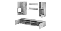 Avec cette composition de meubles de la collection CONNOR effet béton offrez à votre salon un style unique, au top des dernières tendances déco. Cet ensemble de meubles CONNOR est composé de deux vitrines suspendues, 2 étagères et 1 grand meuble TV offrant ainsi de nombreux rangements.