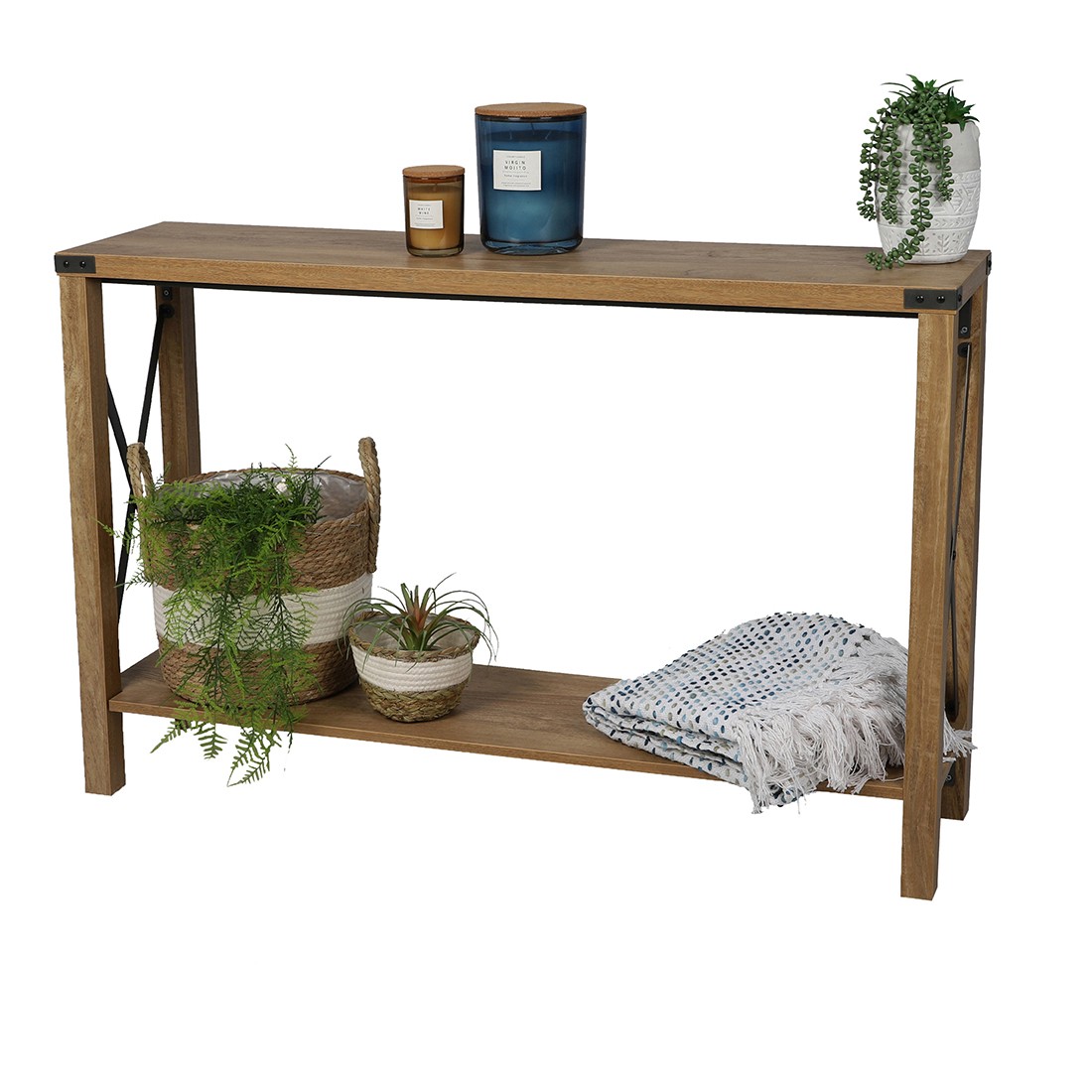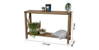 La console BELVINA est parfaite pour un intérieur au style industriel. Sa structure en bois et acier avec des renforts en métal croisé garantit robustesse et durabilité. Dotée de 2 plateaux, elle offre une grande capacité de rangement pour vos objets déco ou accessoires. Avec des dimensions de 117 cm de largeur, 77 cm de hauteur et 29 cm de profondeur, elle s'intègre facilement dans un salon, une entrée ou un bureau. Complétez votre intérieur avec les autres meubles de la collection.
