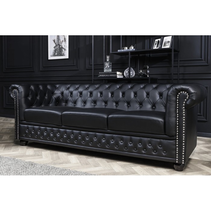 Canapé droit EDGAR – Noir brillant – 3 places – Similicuir style baroque